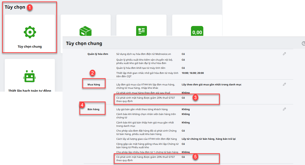 Bước 2: Chọn phần Tùy chọn chung, mục Mua hàng hoặc mục Bán hàng, nhấn vào biểu tượng cái bút Sửa và tích chọn Có phát sinh mặt hàng được giảm 20% thuế GTGT theo quy định. Sau đó, nhấn Cất và nhấn Đóng.
