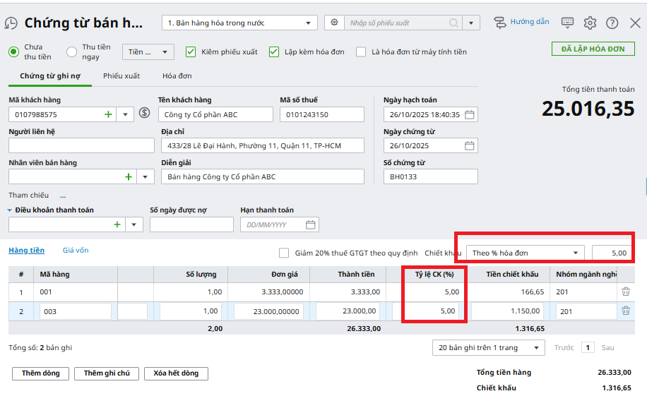 Bài viết hướng dẫn cách ghi nhận nghiệp vụ bán hàng có chiết khấu thương mại trên phần mềm AMIS Kế toán HKD.