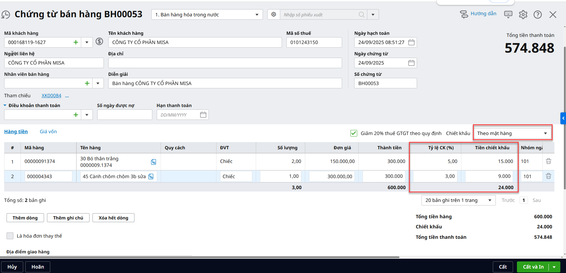 - Cách 1: Chiết khấu theo mặt hàng: Nhập trực tiếp tỷ lệ chiết khấu (hoặc số tiền chiết khấu) cho từng mặt hàng nếu từng mặt hàng có thông tin chiết khấu cụ thể.