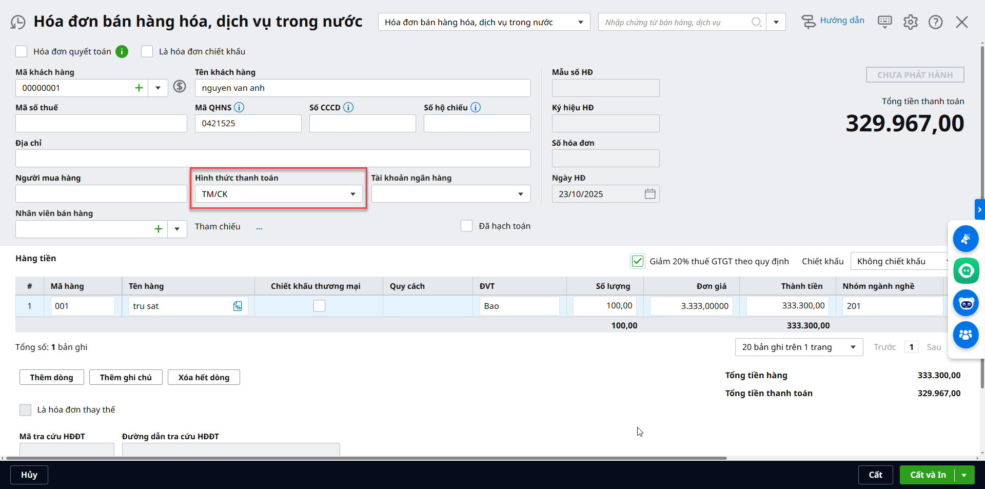 • Anh/chị cần quay lại giao diện nhập liệu của hóa đơn, bổ sung thêm Hình thức thanh toán phù hợp với thực tế phát sinh sau đó phát hành lại hóa đơn. Phần mềm mặc định hiển thị 3 hình thức thanh toán: Tiền mặt, Chuyển khoản, TM/CK. Nếu anh/chị có hình thức thanh toán khác thì nhập liệu trực tiếp vào ô Hình thức thanh toán trên giao diện của phần mềm.