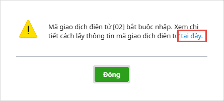 Khi nhấn Cất, màn hình sẽ hiển thị cảnh báo Mã giao dịch [02] bắt buộc nhập. Xem chi tiết cách lấy thông tin mã giao dịch điện tử tại đây.