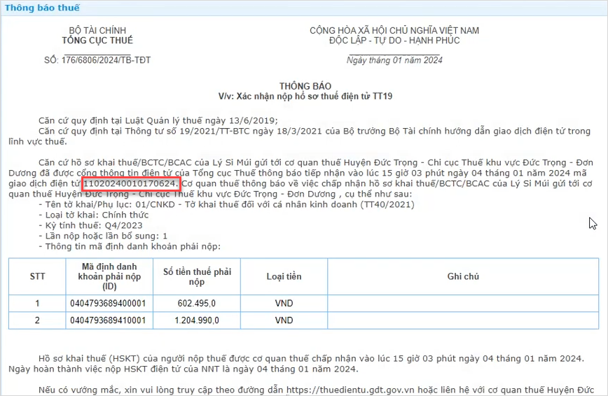 Sau đó, sao chép Mã giao dịch điện tử đã tra cứu vào tờ khai bổ sung đang lập.