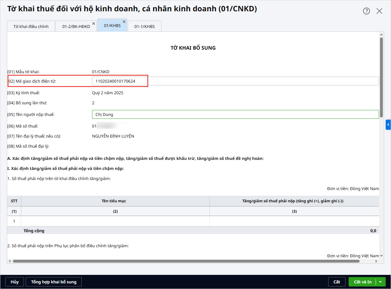 Khi lập tờ khai bổ sung 01/CNKD, nếu không nhập Mã giao dịch của tờ khai lần đầu, hệ thống sẽ báo lỗi. Tuy nhiên, nhiều người dùng thường bỏ qua hoặc không biết lấy mã giao dịch ở đâu.
