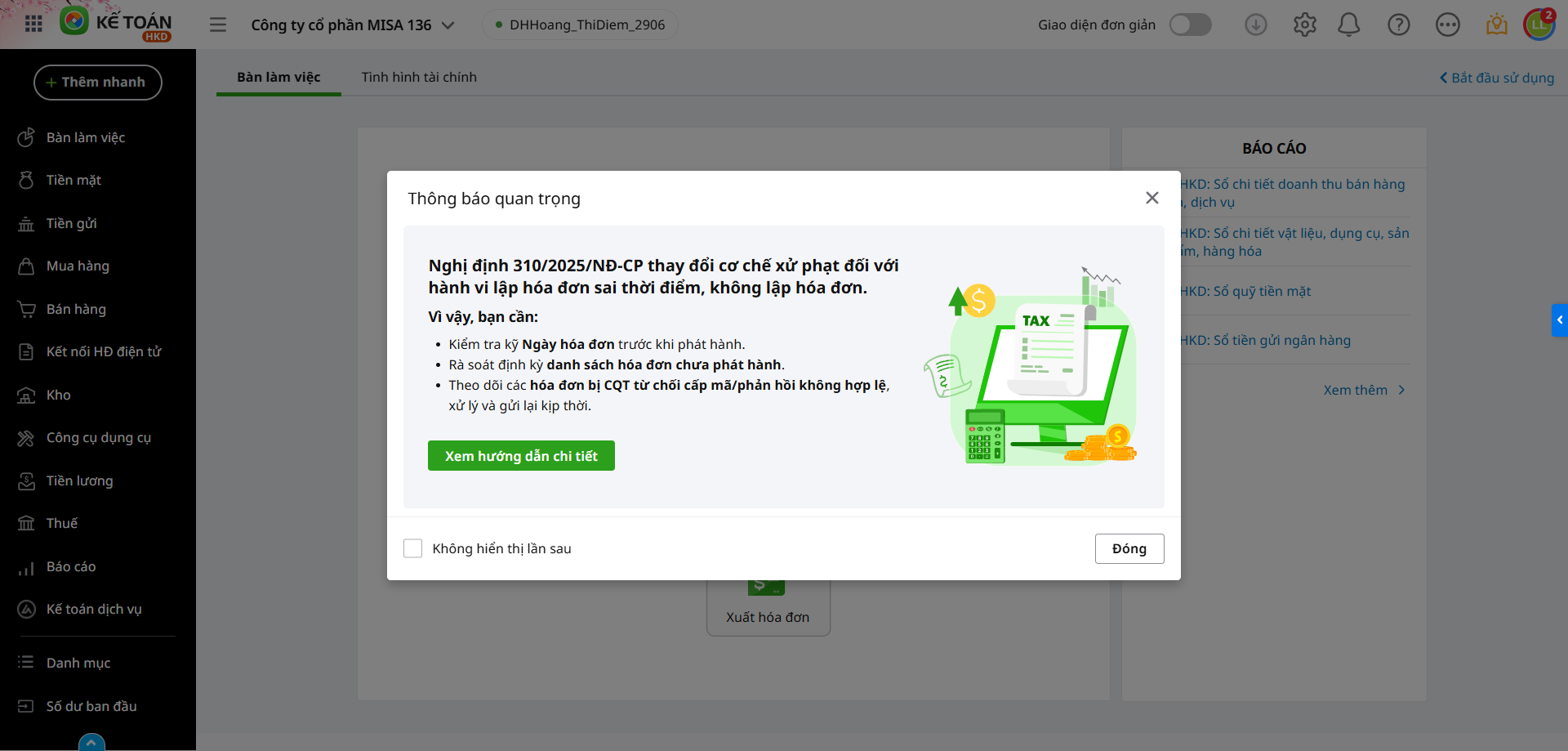 Khi đăng nhập vào ứng dụng, hệ thống sẽ tự động hiển thị Thông báo quan trọng về Nghị định thay đổi cơ chế xử phạt đối với hành vi lập hóa đơn sai thời điểm.