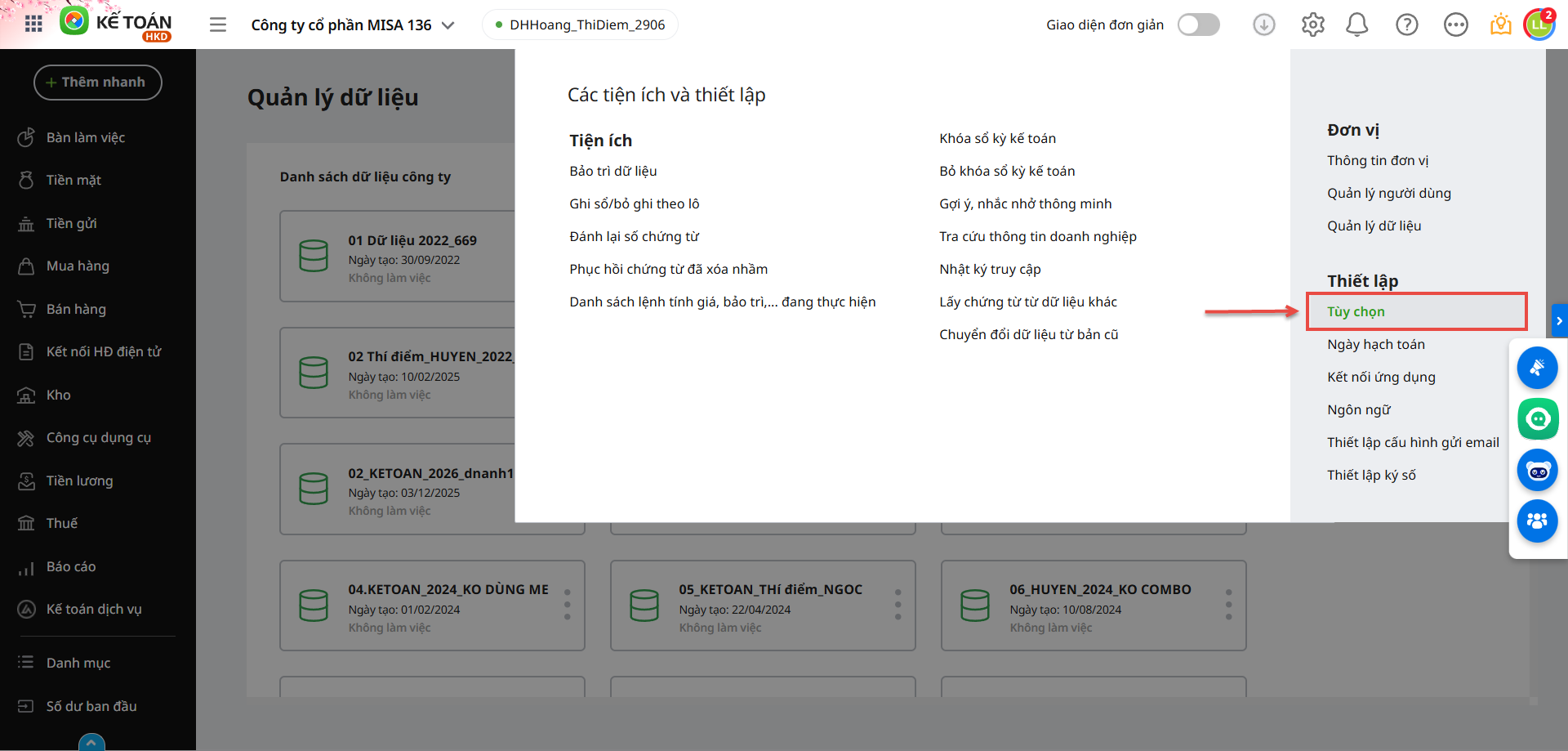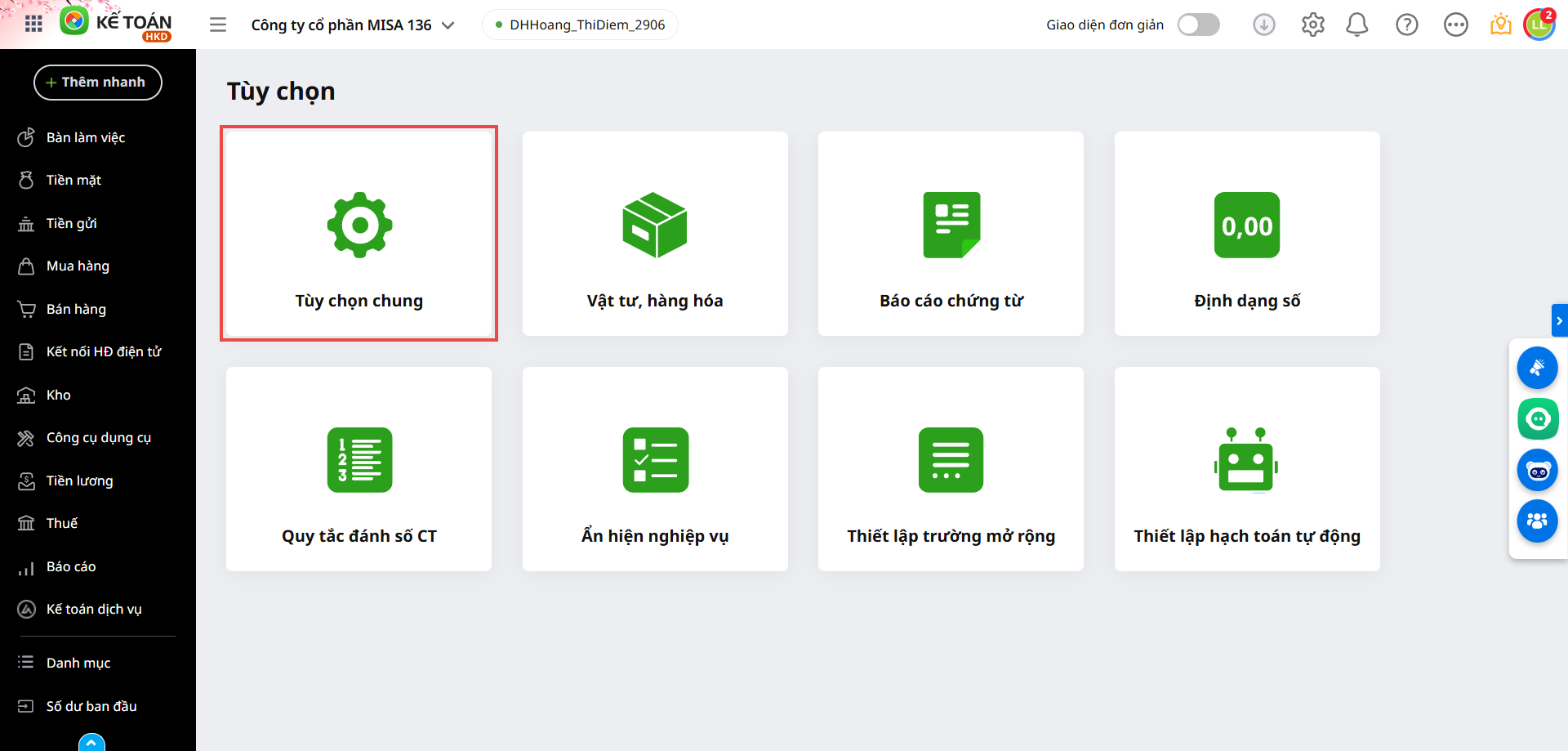 - Nhấn vào biểu tượng bánh răng (⚙) Các tiện ích và thiết lập\ Tuỳ chọn\Tùy chọn chung: