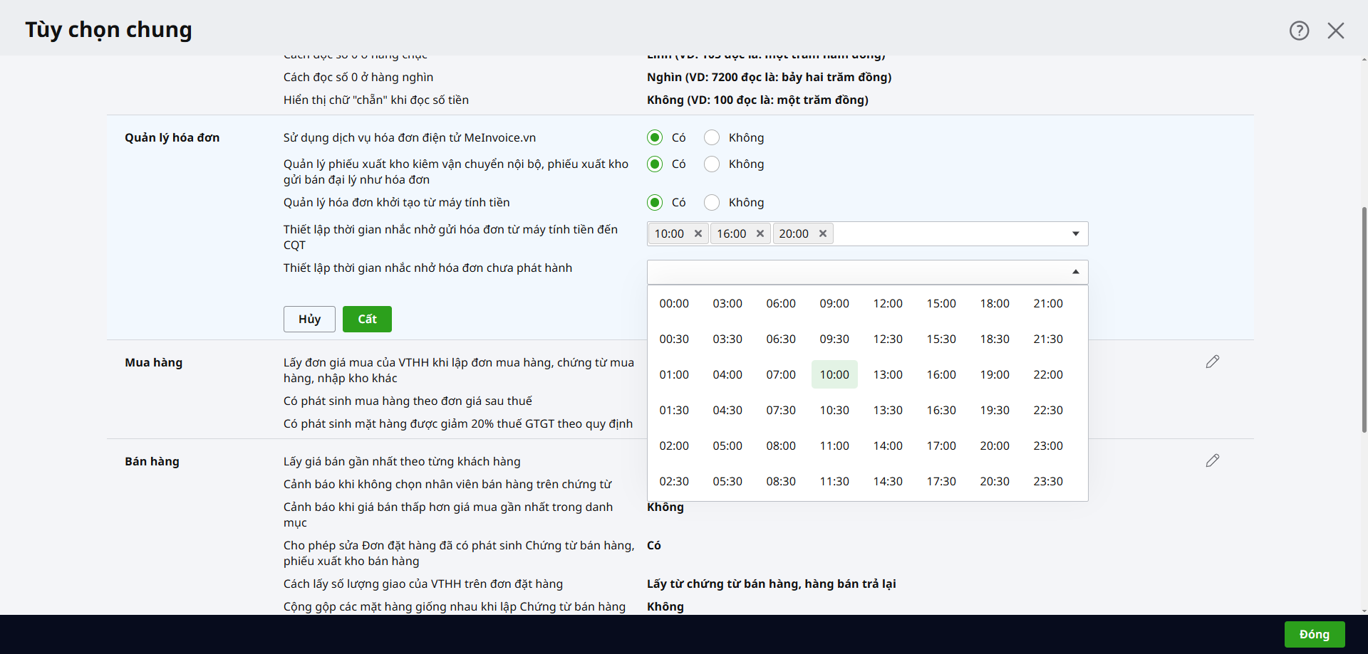 - Tại mục Quản lý hóa đơn, phần Thiết lập thời gian nhắc nhở hóa đơn chưa phát hành, chọn một hoặc nhiều mốc thời gian trong ngày để nhận thông báo (tối đa 4 mốc). Nhấn Cất để lưu thiết lập.