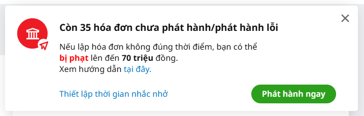 Khi đến thời gian đã thiết lập ở Bước 2 và hệ thống phát hiện có hóa đơn chưa phát hành hoặc phát hành lỗi, thông báo nhắc nhở sẽ hiển thị với thông tin về số lượng hóa đơn chưa phát hành/phát hành lỗi thời cảnh báo về mức phạt có thể phải chịu.