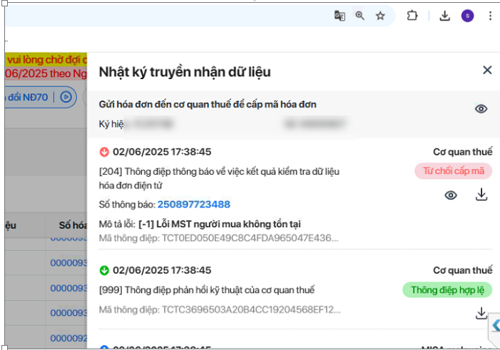 TH1. Lỗi -1 - Lỗi MST người mua không tồn tạiNguyên nhân: Do mã số thuế (MST) người mua không tồn tại trên thuế.