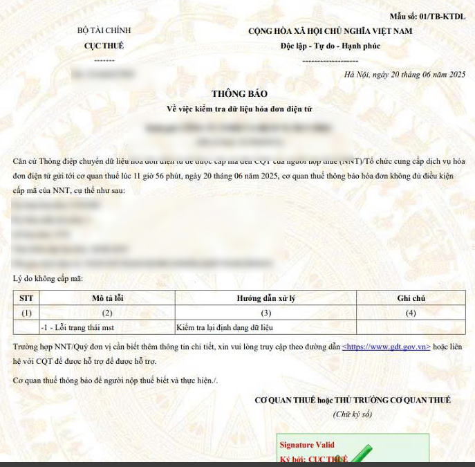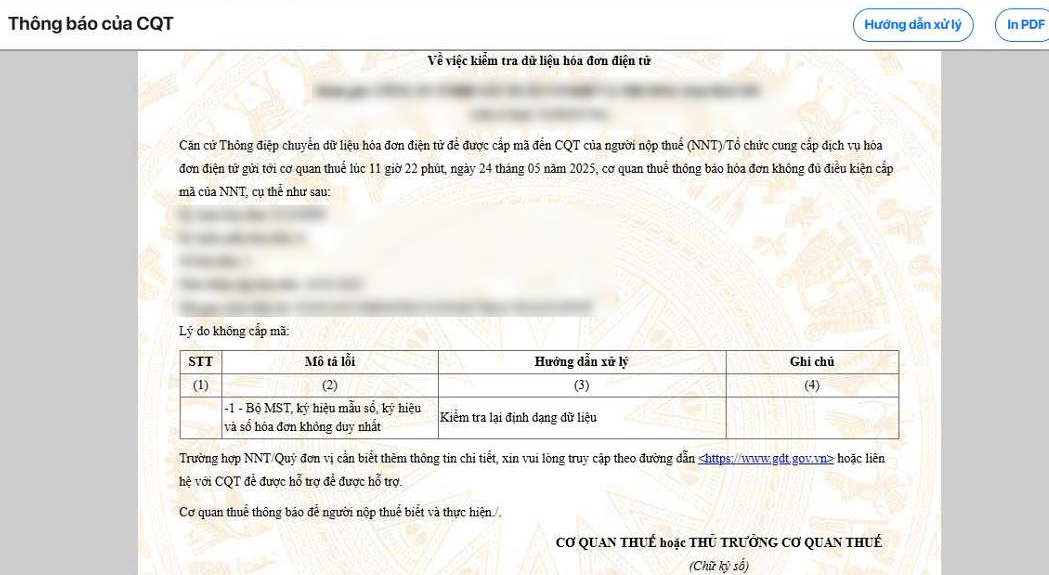 Nội dung bài viết bao gồm hướng dẫn xem và xử lý chi tiết thông báo lỗi từ cơ quan thuế khi bị từ chối cấp mã.