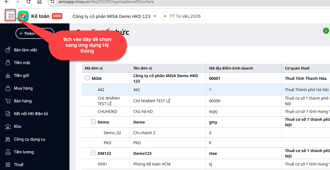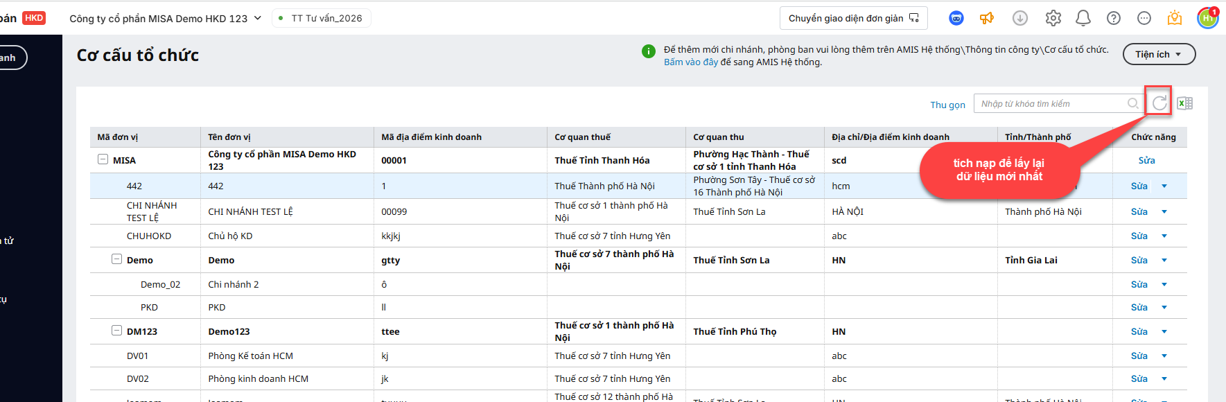 Bước 5: Nhấn Cất. Bước 6: Lập lại tờ khai. 2.4. Trường hợp cảnh báo: Trụ sở/Địa điểm kinh doanh … đang trống Cơ quan thuế, Cơ quan thuBước 1: Anh/chị thực hiện tra cứu thông tin mã CQT và tên CQT theo hướng dẫn tại đây. Bước 2: Trên phần mềm AMIS Kế toán HKD, anh/chị vào phân hệ Danh mục – Cơ cấu tổ chức Bước 3: Tại dòng mã đơn vị có cấp tổ chức là Tổng công ty/Chi nhánh, tích chức năng Sửa. Bước 4: Điền thông tin Cơ quan thuế, vừa tra cứu được và điền thêm Cơ quan thu. Thông tin Cơ quan thu anh/chị điền giống Cơ quan thuế trong trường hợp các địa điểm kinh doanh cùng Cơ quan thuế.