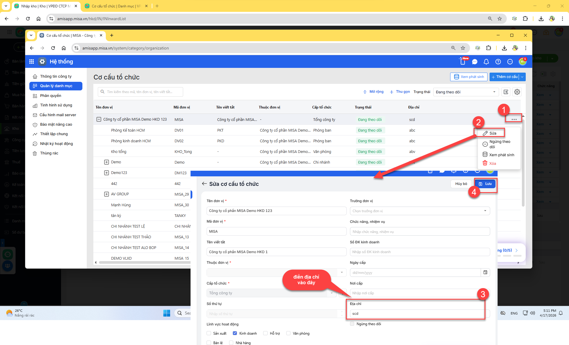 Bước 4: Khai báo địa chỉ cho đơn vị này sau đó nhấn Lưu.