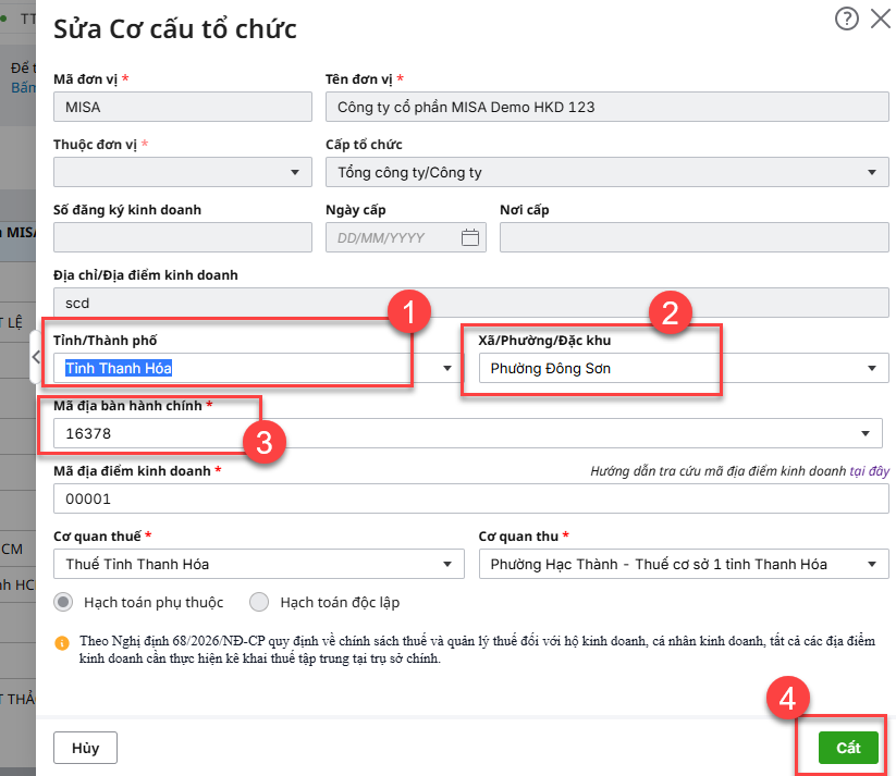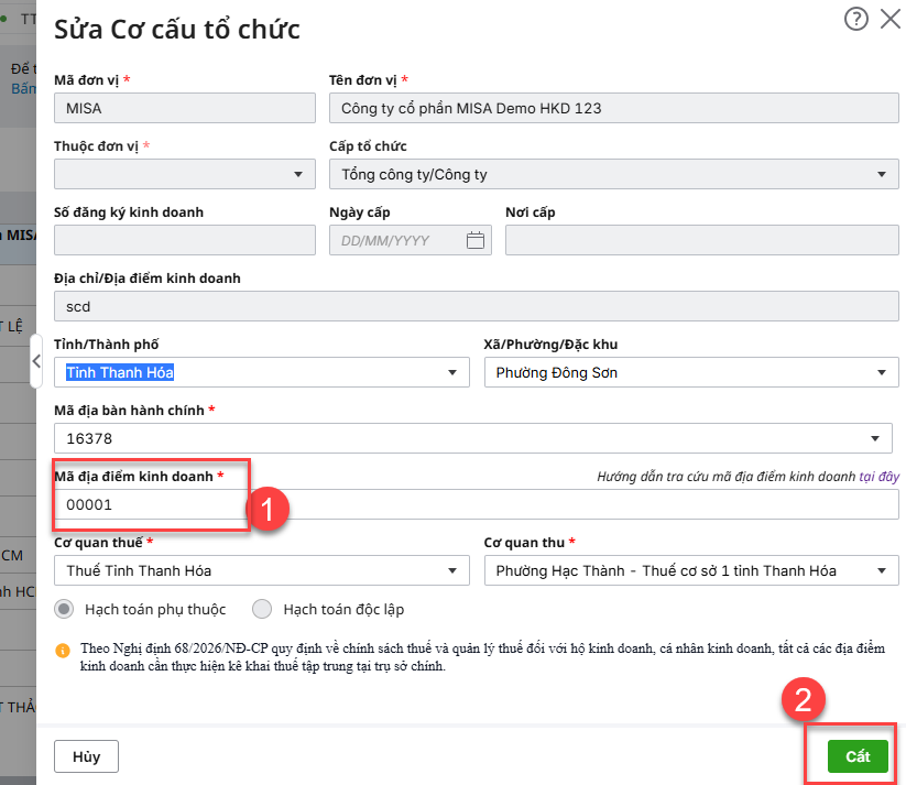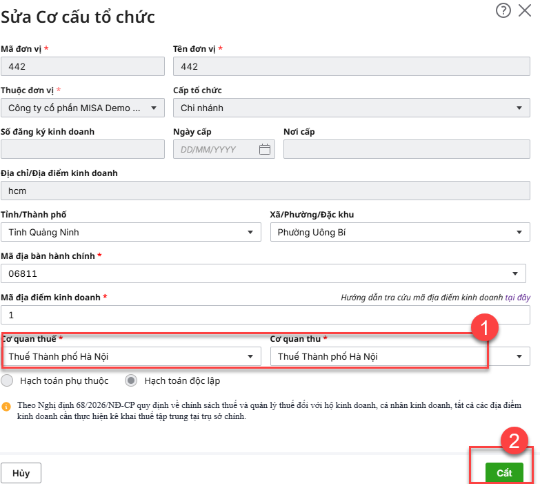 Lưu ý: Nếu khi tích Sửa không thấy có 2 mục Cơ quan thuế, Cơ quan thu thì nguyên nhân là do chưa tách dữ liệu năm 2026 ra một dữ liệu riêng cho đúng thông tư mới, anh/chị cần tách dữ liệu theo hướng dẫn tại đây. Tại dữ liệu năm 2026 vừa mới tách: vào Danh mục – Cơ cấu tổ chức để sửa 2 thông tin này. Bước 5: Nhấn Cất. Bước 6: Lập lại tờ khai. |
