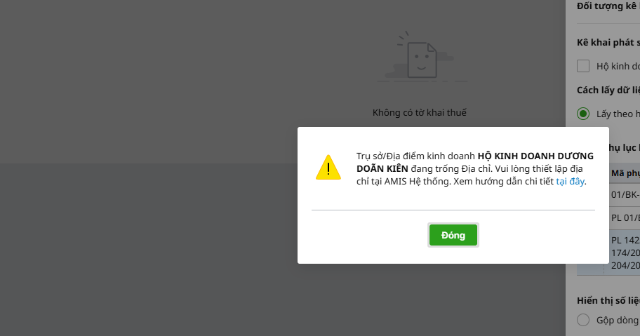 2.1. Trường hợp cảnh báo: Trụ sở/Địa điểm kinh doanh … đang trống Địa chỉNguyên nhân: Do đơn vị chưa khai báo địa chỉ trong AMIS Hệ thống. Thông tin địa chỉ này anh/chị cần phải khai báo ở trong AMIS Hệ thống, không sửa trong phần Cơ cấu tổ chức trên phần mềm AMIS Kế toán HKD vì trên AMIS Kế toán HKD thông tin địa chỉ trong cơ cấu tổ chức mặc định chìm xám, không sửa được. Các bước thực hiện: