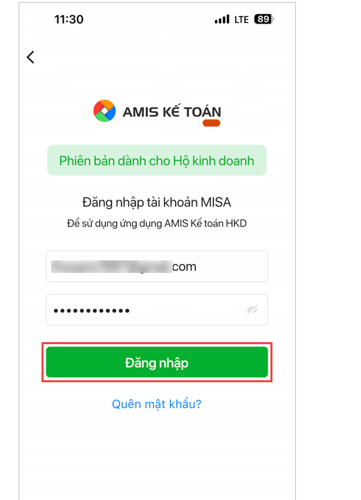 2.2. Đăng nhập vào ứng dụngĐể đăng nhập vào ứng dụng AMIS Kế toán HKD mobile, anh/chị thực hiện như sau: Bước 1: Mở ứng dụng AMIS Kế toán HKD Mobile, nhấn Đăng nhập.