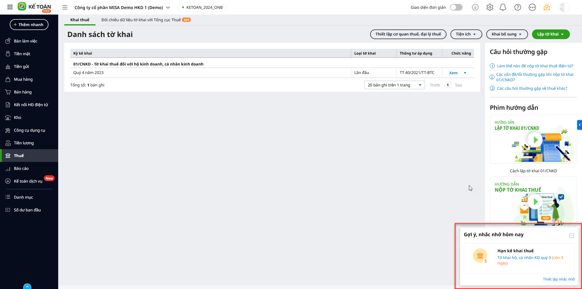 2.1. Các nội dung nhắc nhởHiện nay phần mềm AMIS Kế toán HKD đáp ứng các nội dung nhắc nhở bao gồm: