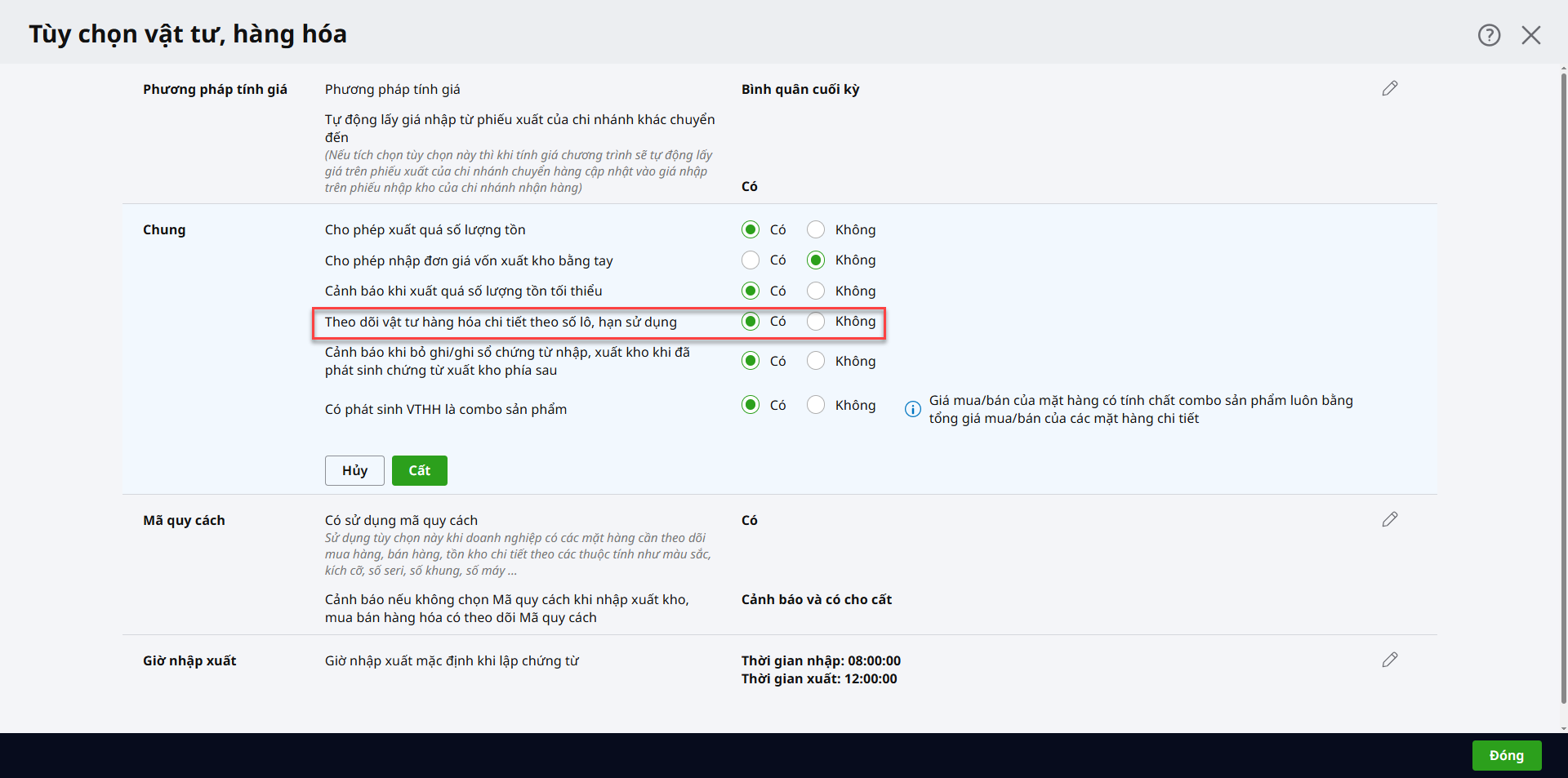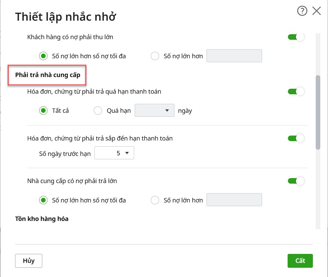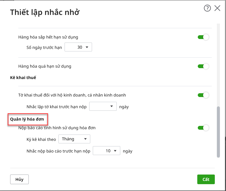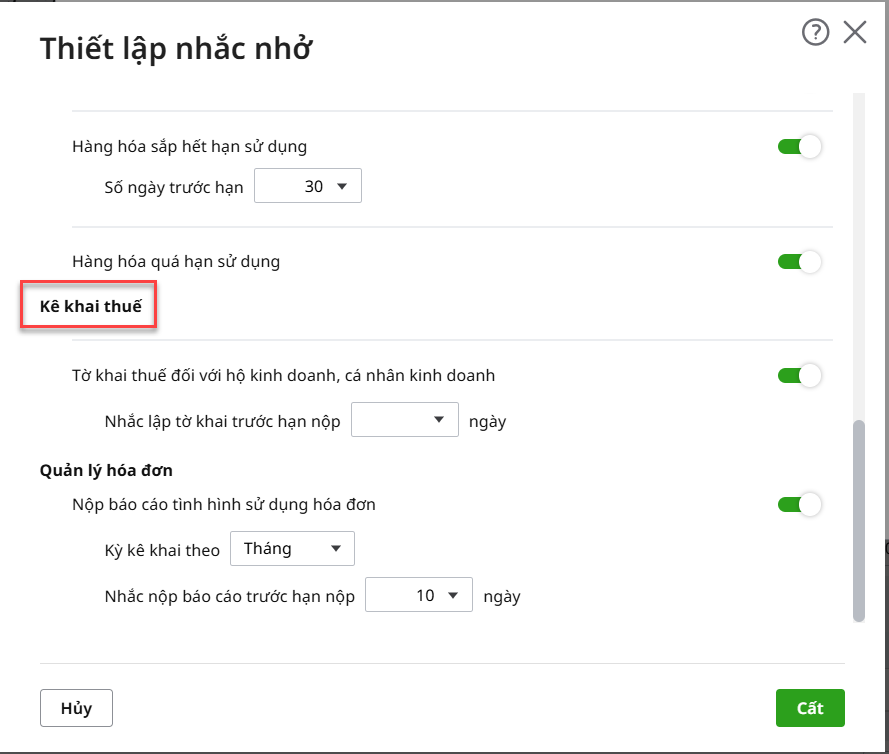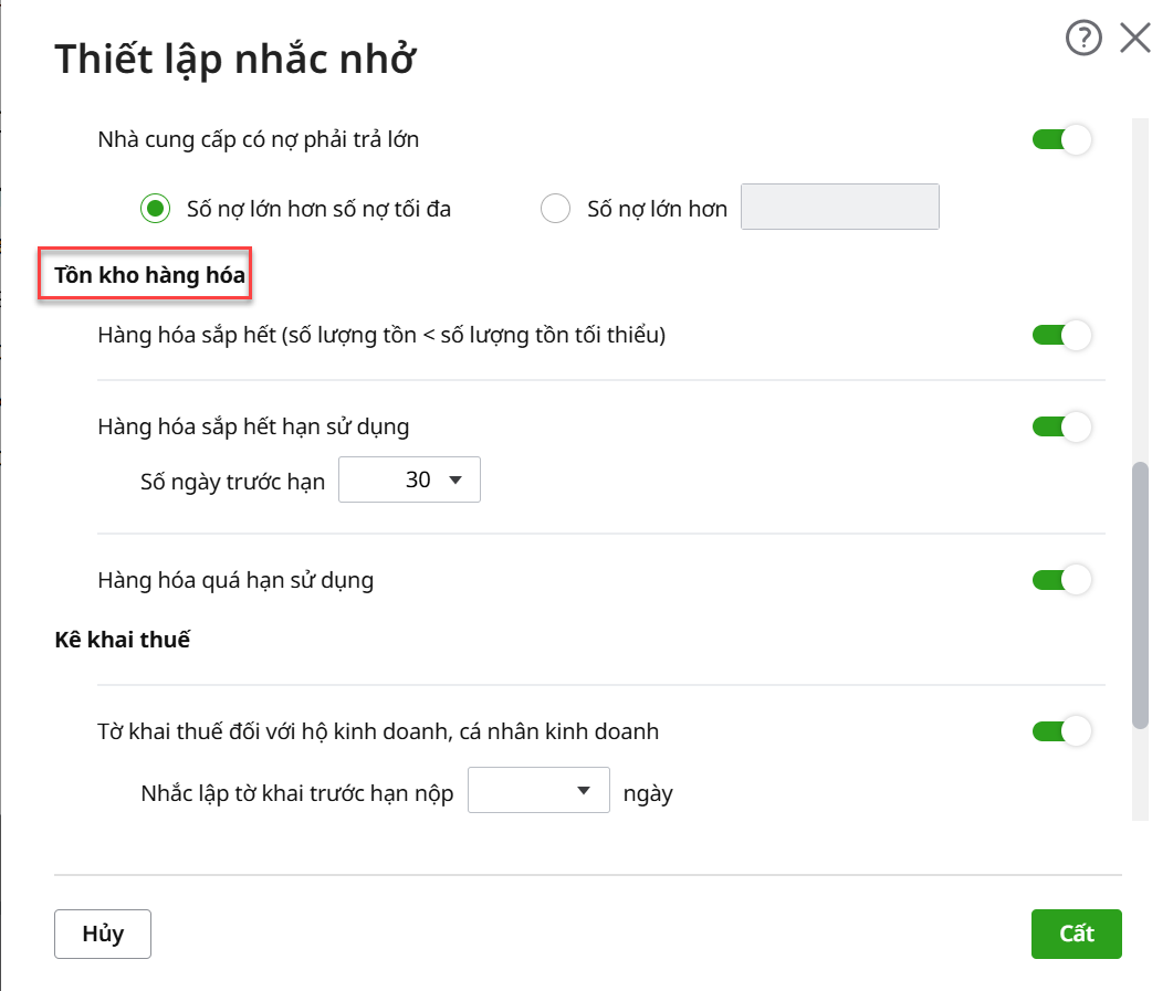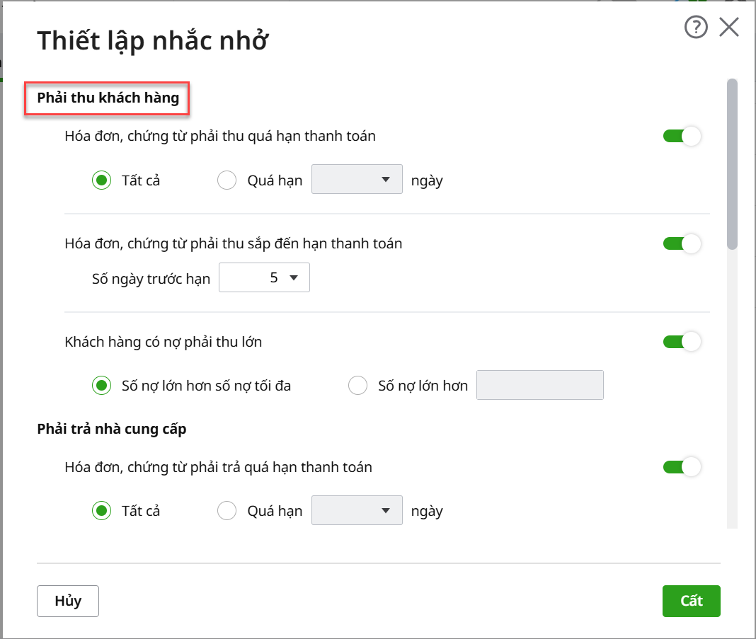 Để thực hiện thiết lập nhắc nhở, anh/chị cần tích vào nút chuyển trạng thái thành màu xanh cho từng mục muốn nhắc nhở.