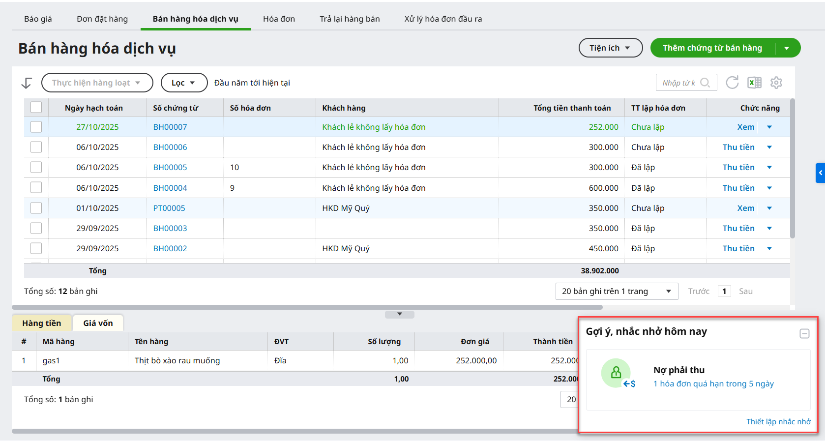 Bài viết giới thiệu về tính năng Gợi ý, nhắc nhở thông minh giúp tự động cảnh báo về công nợ, tình trạng kho, thời hạn kê khai thuế và quản lý hóa đơn.