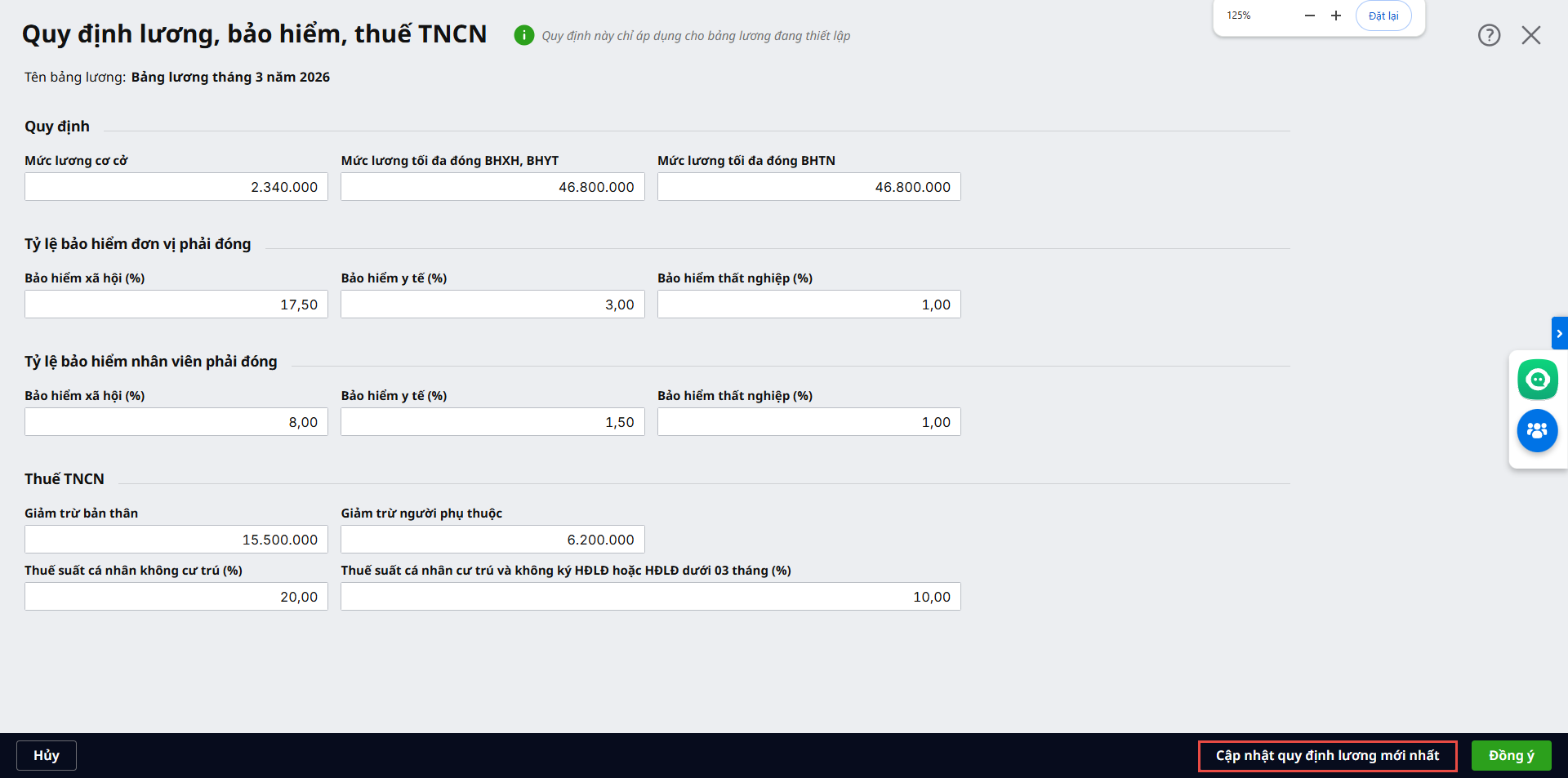 Bước 2: Tại đây, anh/chị có thể chỉnh sửa các thông tin về lương, bảo hiểm và thuế TNCN sau đó nhấn Đồng ý. Lưu ý: sau khi chỉnh sửa, nếu anh/chị chọn chức năng Cập nhật quy định lương mới nhất, chương trình sẽ tự động lấy lại thông tin quy định lương đã thiết lập ban đầu được thiết lập tại mục Tiền lương\Thiết lập quy định lương, bảo hiểm, thuế TNCN