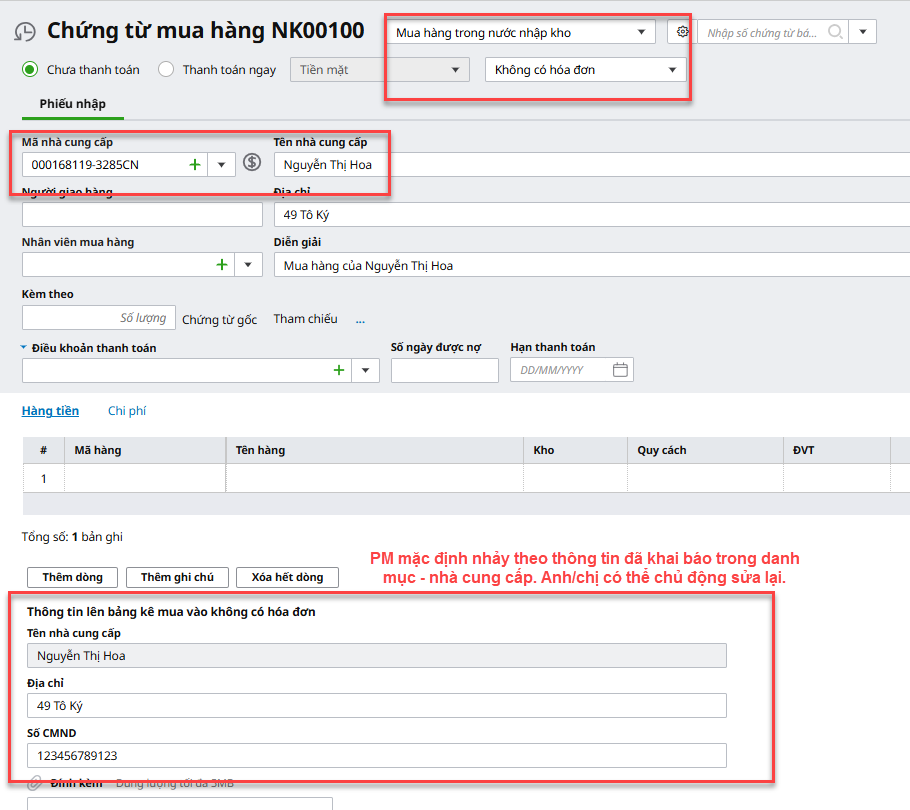 - Chọn nhà cung cấp: khi anh/chị chọn mã nhà cung cấp thì các thông tin Tên người bán, Địa chỉ, Số CMT nhân dân ở mục Thông tin lên bảng kê mua vào không có hóa đơn sẽ mặc định lấy lên theo đúng nội dung mà anh/chị đã khai báo trong danh mục – nhà cung cấp. Các thông tin này chính là thông tin được in lên mẫu 01/TNDN – Bảng kê thu mua hàng hóa, dịch vụ mua vào không có hóa đơn.