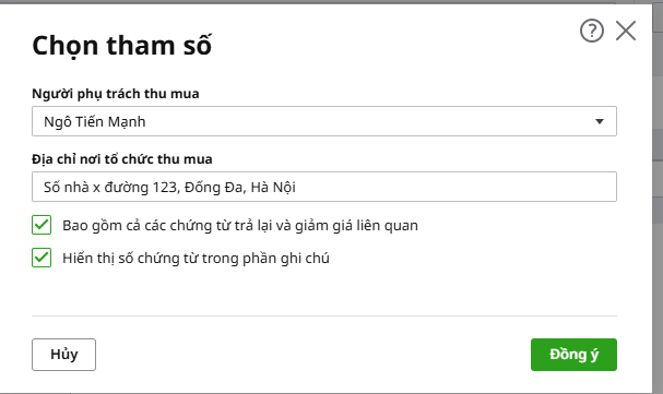- Có thể tích chọn Bao gồm các chứng từ trả lại và giảm giá liên quan/Hiển thị số chứng từ trong phần ghi chú để theo dõi.