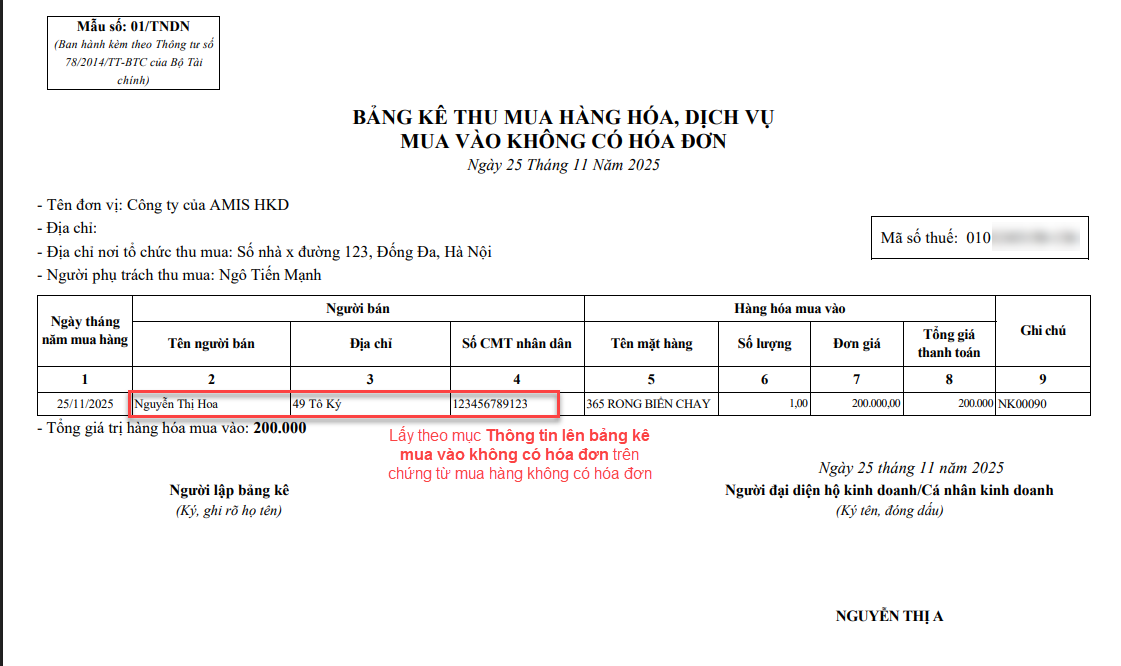 Bài viết hướng dẫn cách lập và in Bảng kê thu mua hàng hóa, dịch vụ mua vào không có hóa đơn (Mẫu 01/TNDN) theo yêu cầu của cơ quan thuế trên phần mềm AMIS Kế toán HKD.