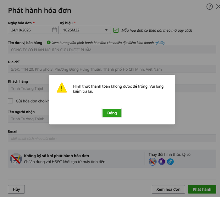 Trường hợp 2: Hóa đơn của tôi chưa có thông tin Hình thức thanh toán (Thông tin bắt buộc theo Nghị định 70/2025/NĐ-CP) thì làm thế nào?Trả lời: Khi phát hành hóa đơn mà thiếu thông tin “Hình thức thanh toán”, phần mềm AMIS Kế toán HKD sẽ hiển thị cảnh báo: