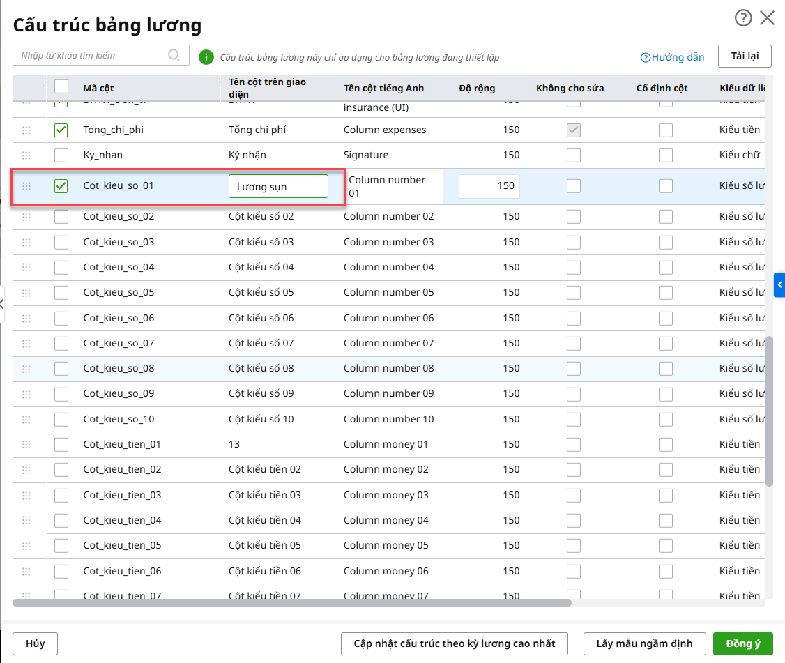 Bước 4: Trường hợp anh/chị muốn thêm cột mới ngoài cột đã có trên bảng lương mặc định của phần mềm thì tích chọn Hiển thị đối với các cột có tên là Cột kiểu số, Cột kiểu tiền, … trở đi nhập lại tên hiển thị của cột trên bảng lương tại cột Tên cột trên giao diện.