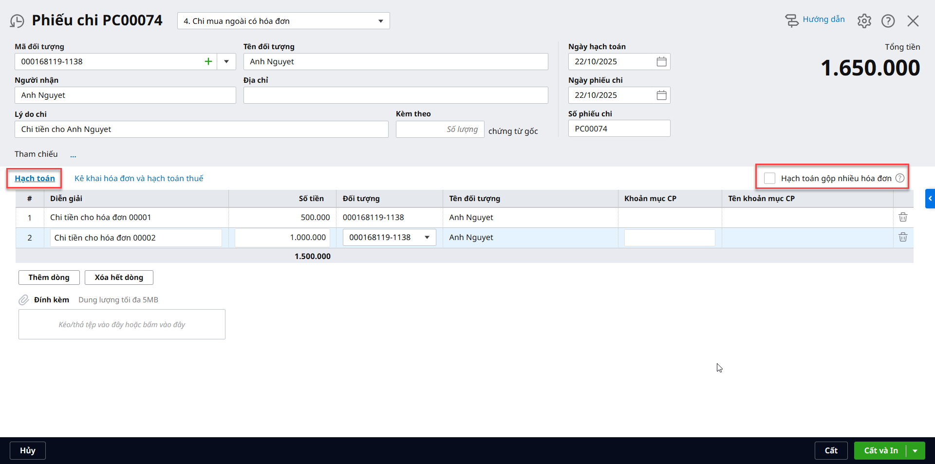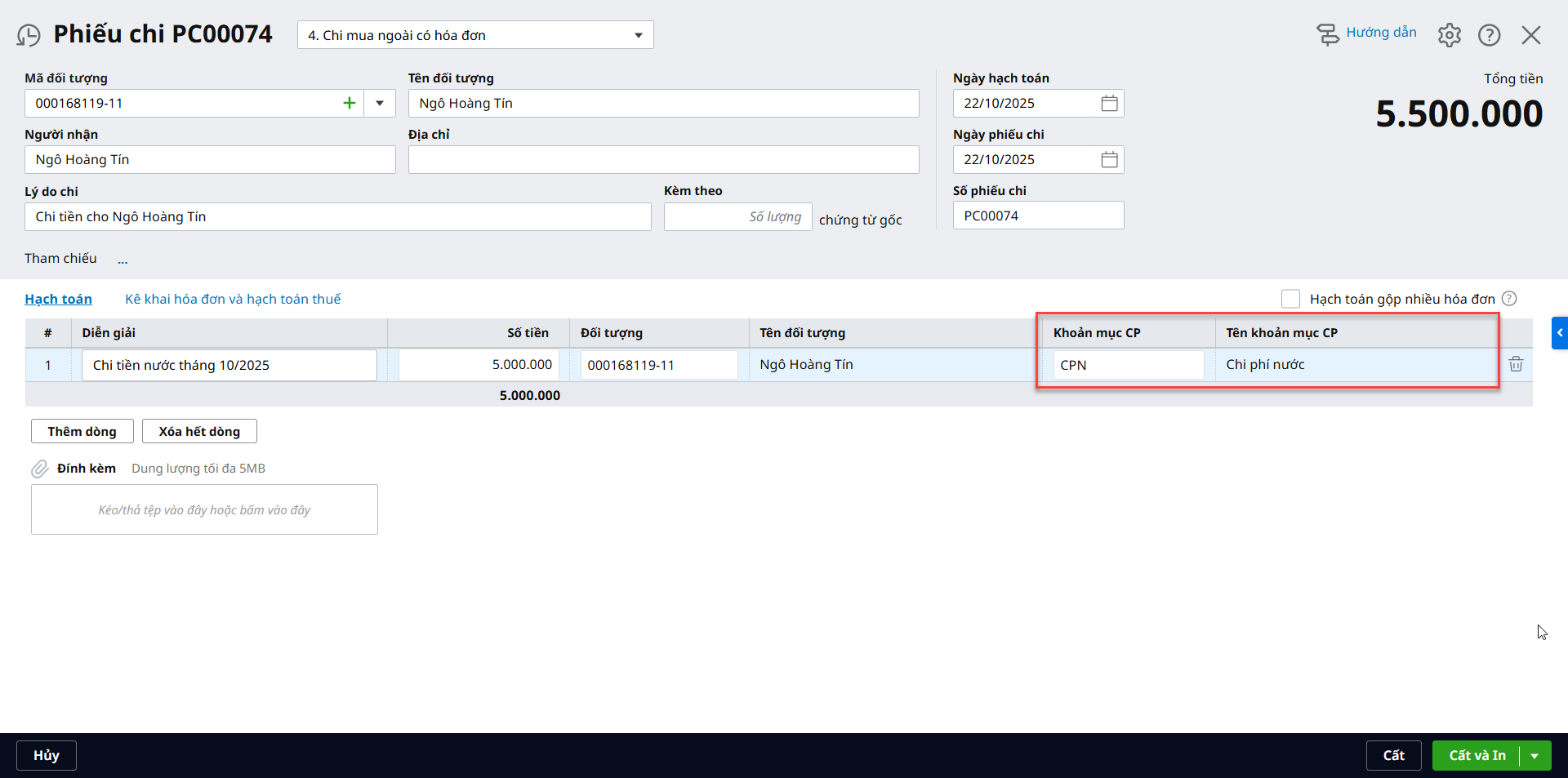 - Khai báo thông tin chung: Mã đối tượng, Người nhận, Lý do chi,…