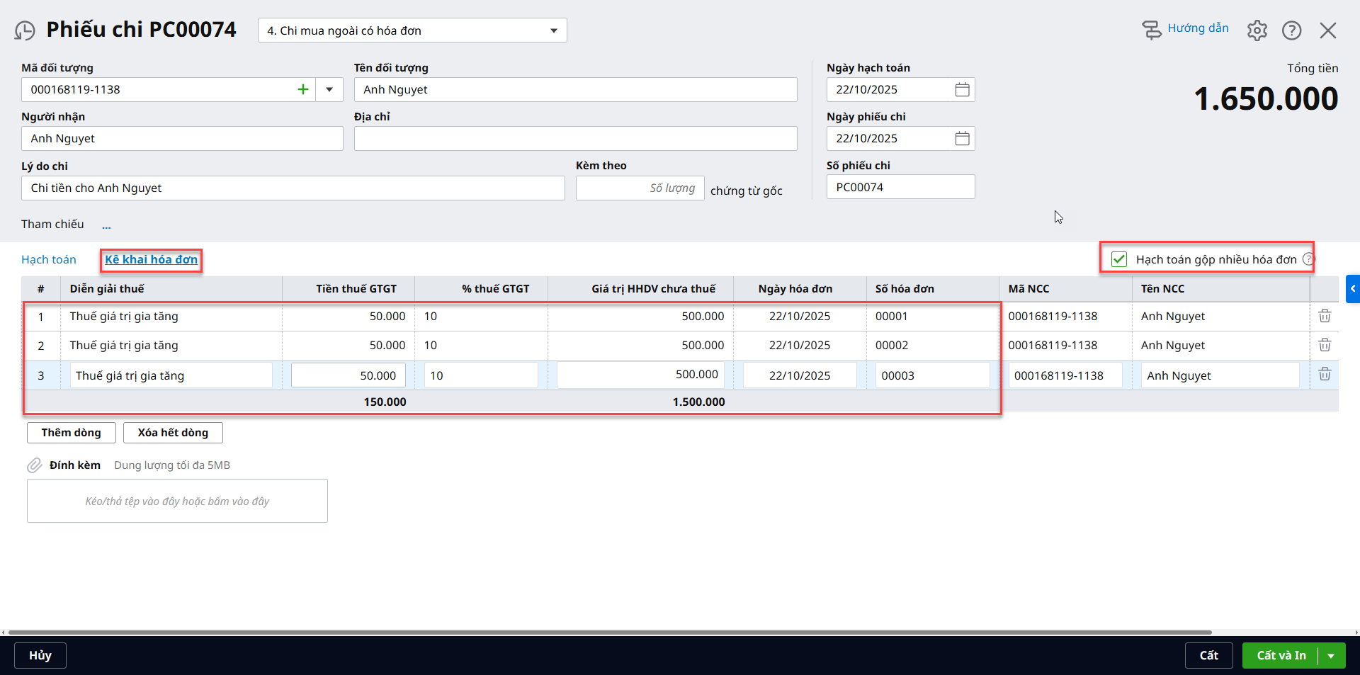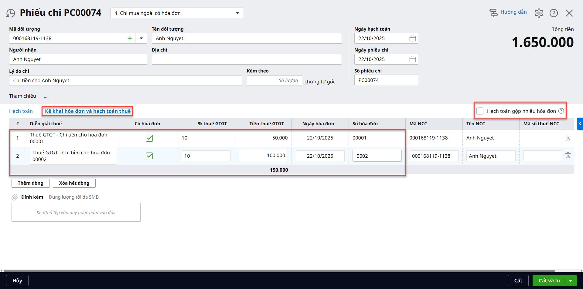 Trường hợp 2: Trường hợp tích chọn Hạch toán gộp nhiều hóa đơn
