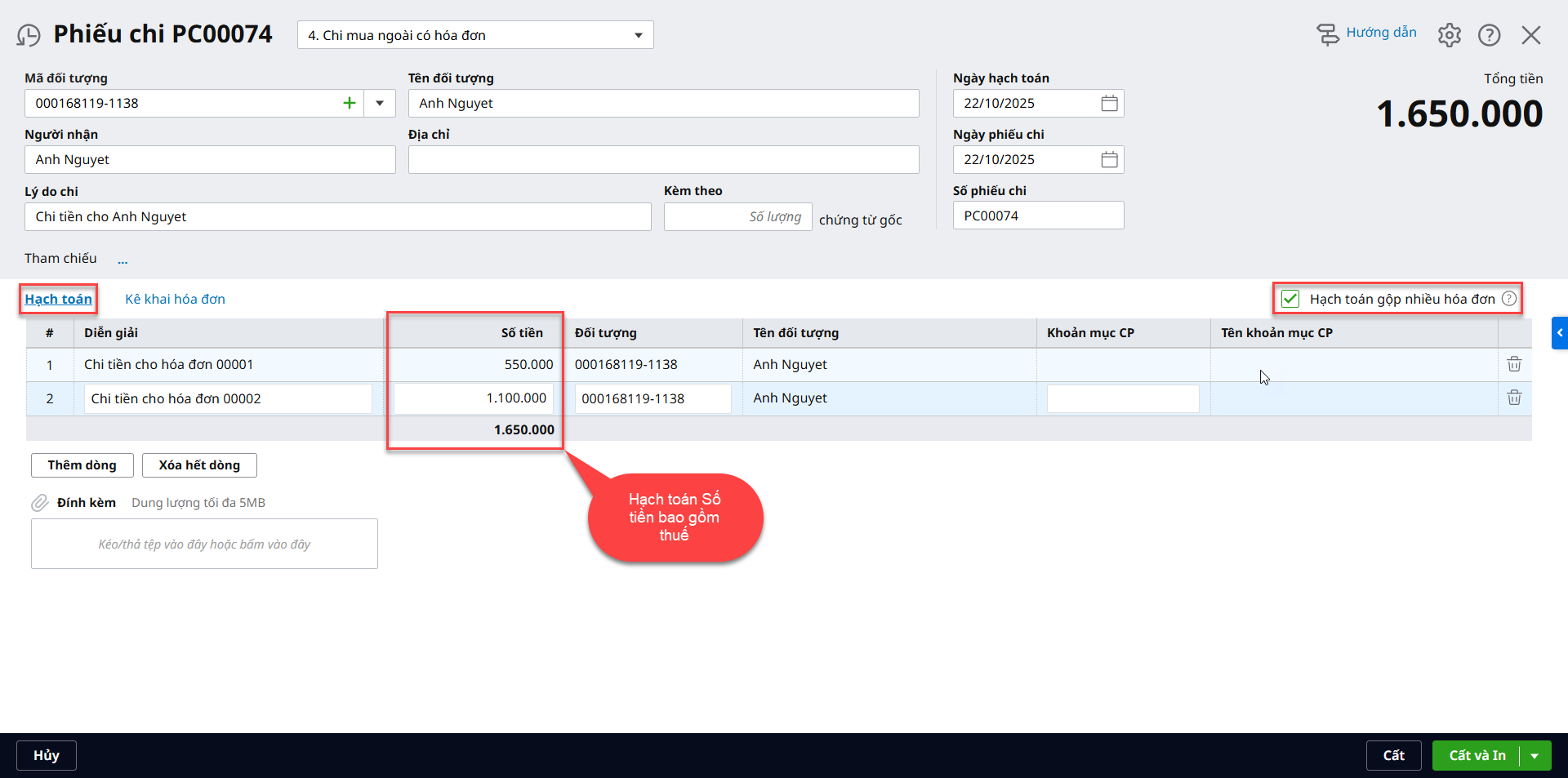- Tab Hạch toán: Phải hạch toán Số tiền bao gồm thuế.