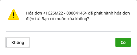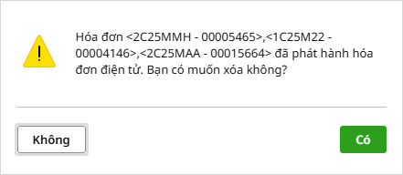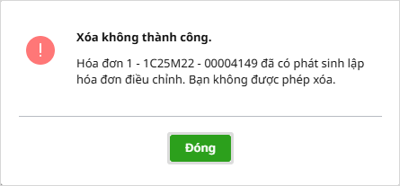 2.2. Các trường hợp không được phép xóaHệ thống không cho phép xóa các chứng từ, hóa đơn đã phát sinh thay thế/điều chỉnh/hóa đơn có phát sinh chứng từ xử lý hóa đơn không hợp lệ/ chứng từ, hóa đơn đã được kê khai lên tờ khai thuế và hiển thị cảnh báo trên phần mềm, cụ thể như sau: 1. Chứng từ/hóa đơn đã có phát sinh lập hóa đơn thay thế, hóa đơn điều chỉnh, hoặc xử lý hóa đơn không hợp lệ: Khi Xóa, màn hình hiển thị thông báo: Hóa đơn <ký hiệu – số hóa đơn> đã có phát sinh xử lý hóa đơn không hợp lệ/hóa đơn thay thế/hóa đơn điều chỉnh. Bạn không được phép xóa.