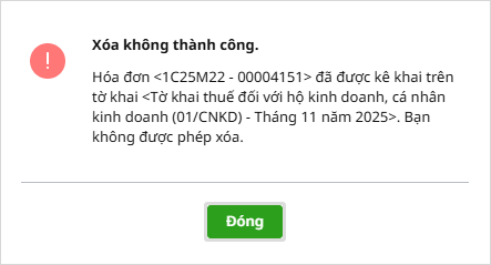 2. Với tờ khai: Khi Xóa, màn hình hiển thị cảnh báo: Hóa đơn <ký hiệu – số hóa đơn> đã được kê khai trên tờ khai – kỳ kê khai. Bạn không được phép xóa.