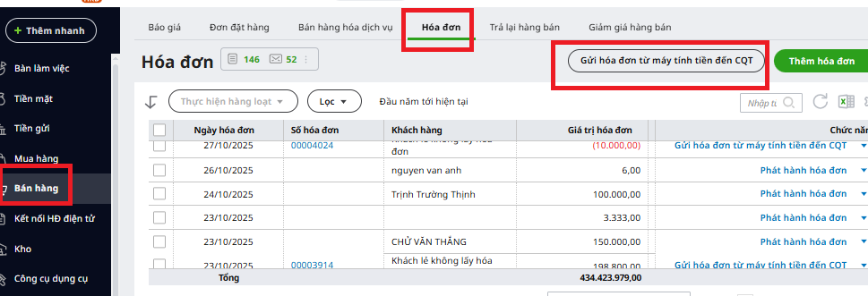 Thao tác gửi hóa đơn máy tính tiền đến CQT theo các bước sau:
