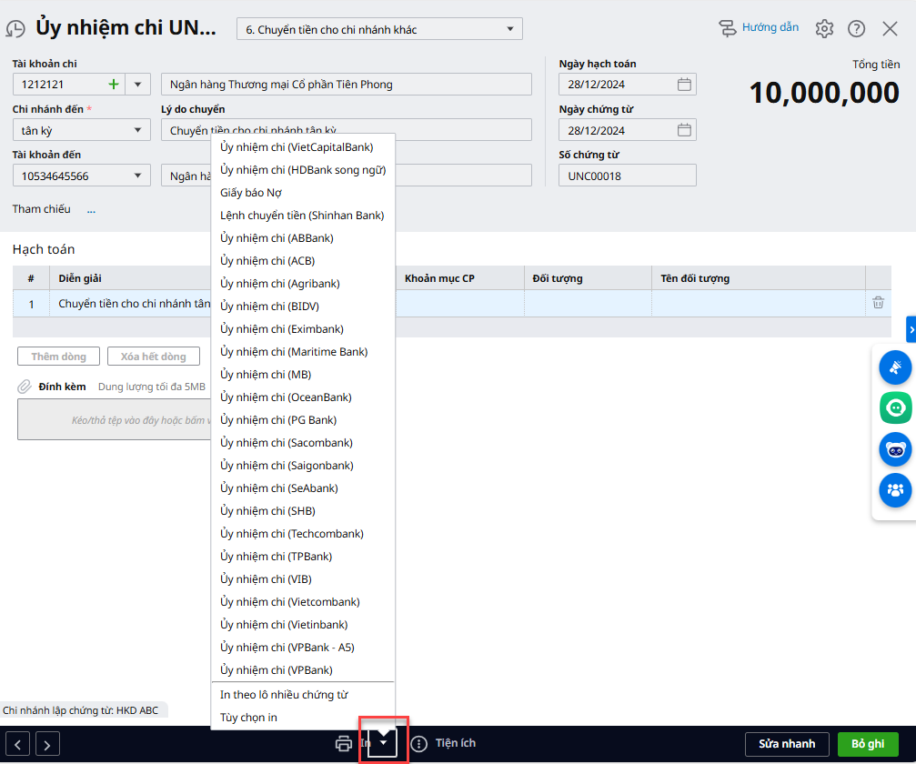 Bước 3: Khai báo thông tin chứng từ: Tài khoản chi, chọn Chi nhánh đến, Lý do chuyển, Số tiền,… Bước 4: Nhấn Cất. Bước 5: Chọn biểu tượng mũi tên (▼) cạnh nút In, sau đó chọn mẫu chứng từ cần in.