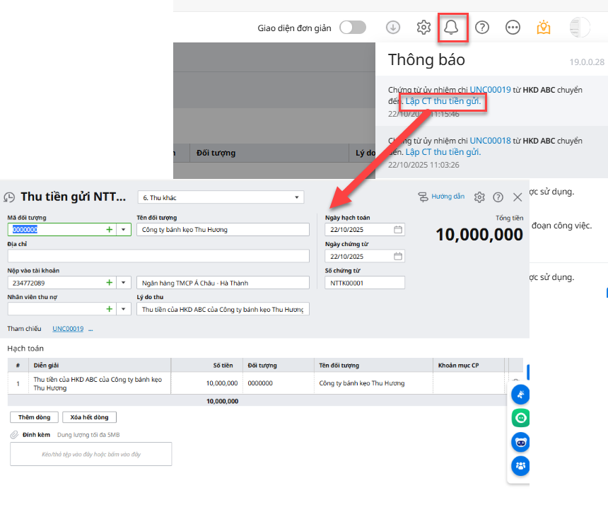 2.2. Tại chi nhánh nhận tiềnỞ phần Gợi ý, nhắc nhở và ở quả chuông thông báo trên phần mềm sẽ nhận được thông báo có chứng từ ủy nhiệm chi từ chi nhánh khác.