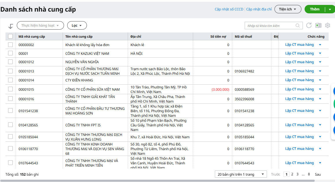 Trong trường hợp này, việc số tiền nợ hiển thị âm là đúng với bản chất nghiệp vụ. Khi phát sinh các khoản công nợ phải trả mới với nhà cung cấp đó, hệ thống sẽ tự động bù trừ dần vào số tiền đã trả trước, và cột Số tiền nợ sẽ cập nhật lại tương ứng.