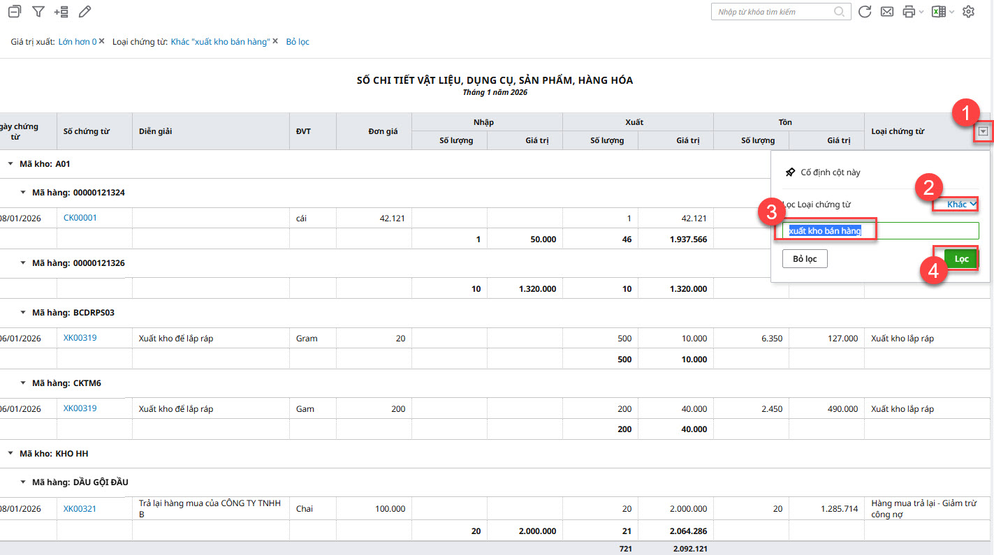 Bước 2: Tại giao diện Sổ chi tiết vật liệu, dụng cụ, sản phẩm, hàng hóa, tại cột Giá trị Xuất lọc điều kiện lớn hơn 0, cột Loại chứng từ chọn điều kiện Khác và gõ Xuất kho bán hàng, xem có chứng từ nào hạch toán khác chứng từ xuất kho bán hàng hay không (trường hợp không thấy cột Loại chứng từ thì hiển thị cột trên báo cáo theo hướng dẫn tại đây).