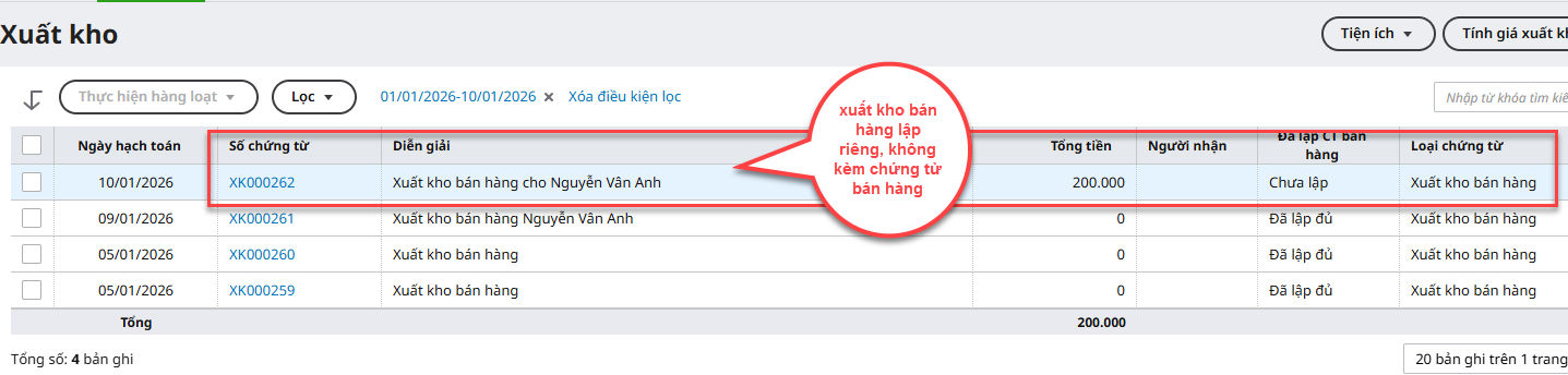 Nguyên nhân 1: Do lập phiếu xuất kho bán hàng riêng, không lập kèm chứng từ bán hàng