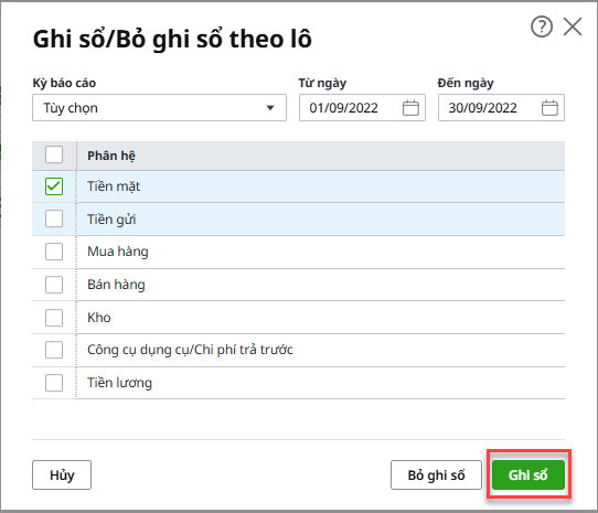 Cách thực hiện ghi sổ, bỏ ghi theo lô như sau: