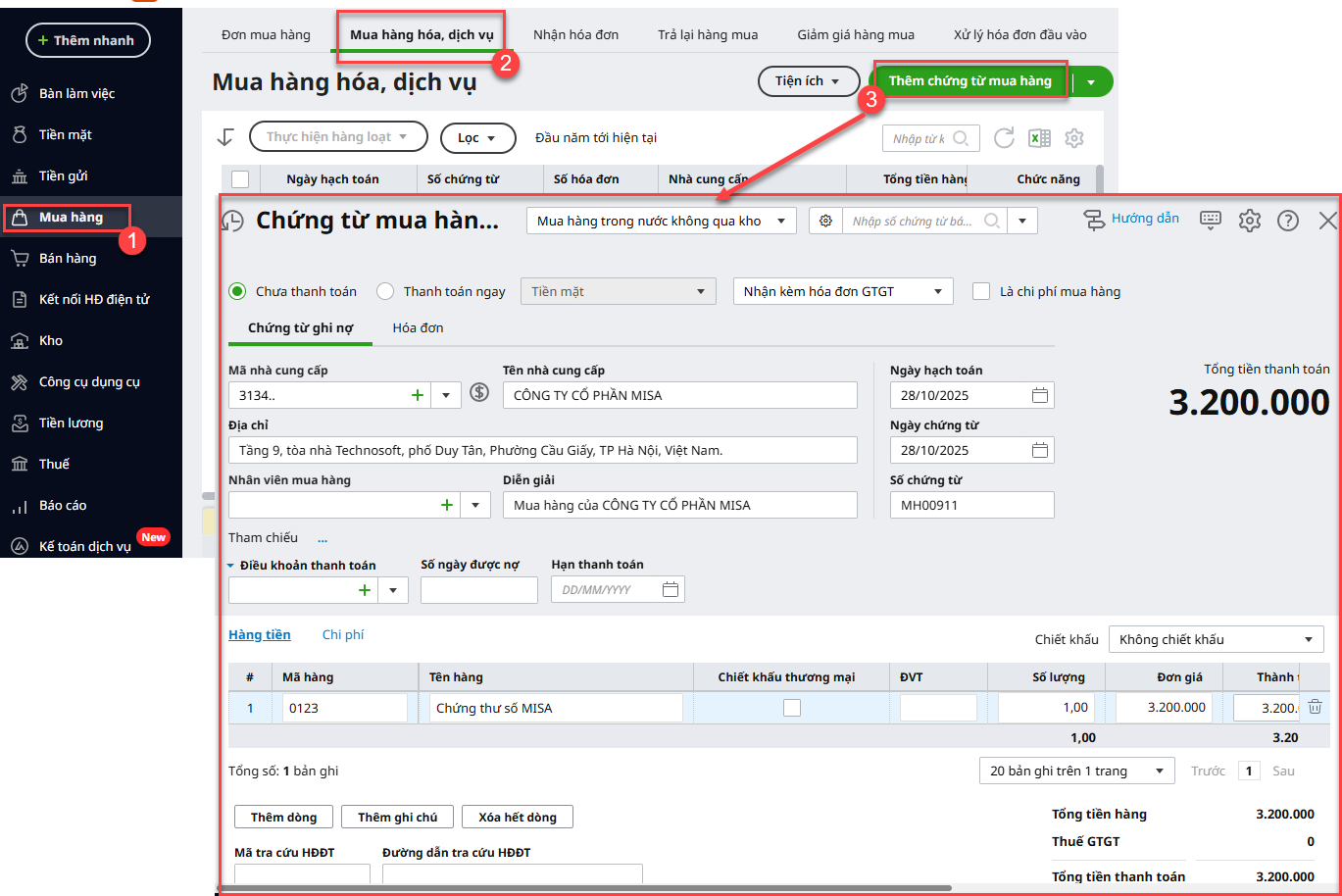 - Hoặc vào phân hệ Mua hàng\Mua hàng hóa, dịch vụ\Thêm chứng từ mua hàng\ chọn Mua hàng trong nước không qua kho (trường hợp mua ccdc chưa thanh toán).