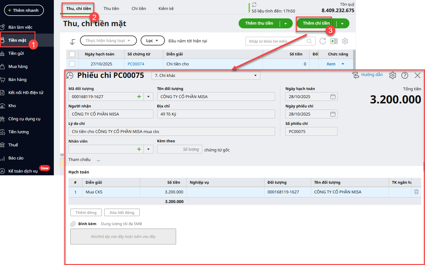 - Vào phân hệ Tiền mặt\Thu,chi tiền\Thêm chi tiền hoặc Tiền gửi\Thu, chi tiền\Thêm chi tiền (trường hợp mua ccdc thanh toán ngay)