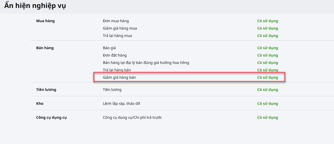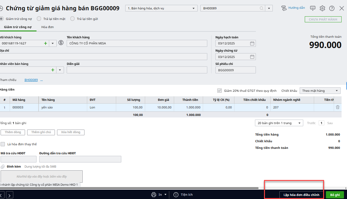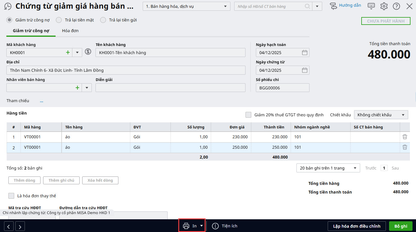 Bài viết hướng dẫn cách lập chứng từ giảm giá hàng bán trên phần mềm để ghi nhận khoản giảm trừ doanh thu cho khách hàng. Lưu ý: Để hiển thị tab Giảm giá hàng bán trên phân hệ Bán hàng, anh/chị cần tích chọn Có sử dụng nghiệp vụ Giảm giá hàng bán trên Các tiện ích và Thiết lập\Tùy chọn\Ẩn hiện nghiệp vụ. Nghiệp vụ giảm giá hàng bán được thực hiện trên phần mềm như sau: Bước 1: Vào phân hệ Bán hàng, chọn tab Giảm giá hàng bán, nhấn Thêm giảm giá hàng bán. Bước 2: Chọn chứng từ bán hàng có mặt hàng được giảm giá theo một trong hai cách sau: Cách 1: Nhấn vào biểu tượng mũi tên (▼) để chọn chứng từ bán hàng trong danh sách. Cách 2: Nhấn vào biểu tượng kính lúp để tìm và chọn chứng từ bán hàng gốc. Nếu không xác định được chính xác giảm giá cho chứng từ bán hàng gốc nào thì anh/chị bỏ qua bước này. Bước 3: Hoàn thiện thông tin chứng từ giảm giá hàng bán. – Lựa chọn phương thức giảm trừ là Giảm trừ công nợ hoặc Trả lại tiền mặt hoặc Trả lại tiền gửi. – Khai báo thêm các thông tin trên chứng từ giảm giá hàng bán như: số lượng hàng được giảm, giá trị giảm,… Bước 4: Nhấn Cất. Bước 5: Chọn biểu tượng mũi tên (▼) cạnh nút In, sau đó chọn mẫu chứng từ cần in. Lưu ý: Theo quy định, khi thực hiện giảm giá hàng bán, người bán phải phát hành hóa đơn điều chỉnh giảm để ghi nhận việc giảm giá theo đúng quy định về hóa đơn.I. Tổng quan