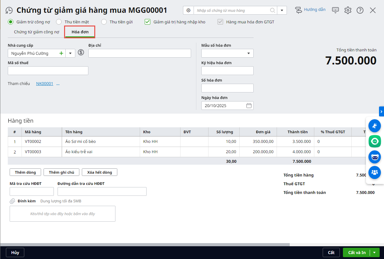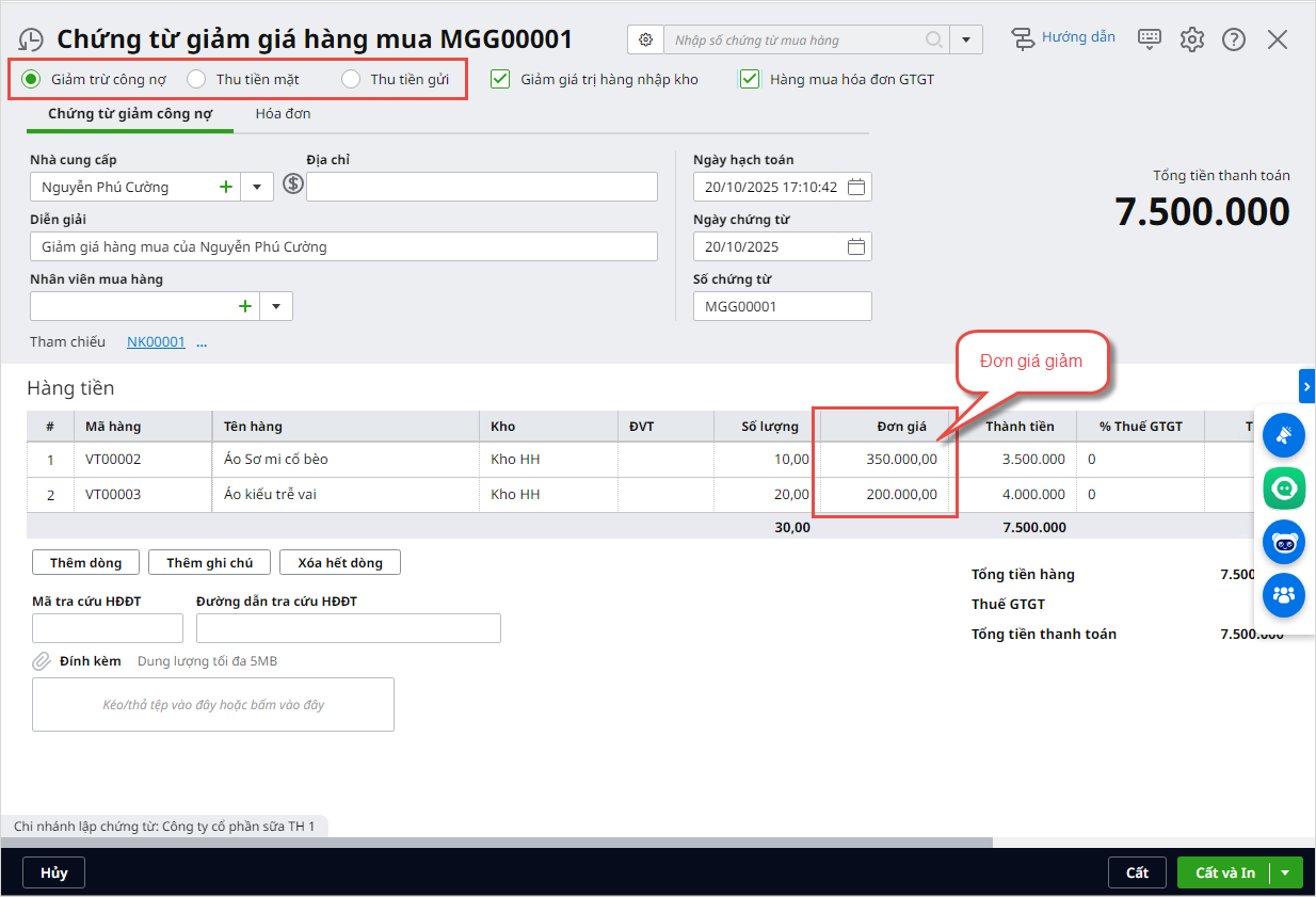 Bước 3: Hoàn thiện thông tin chứng từ giảm giá hàng mua.
