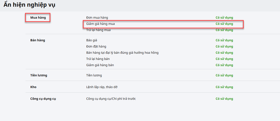 Lưu ý: Để hiển thị tab Giảm giá hàng mua trên phân hệ Mua hàng, anh/chị cần tích chọn Có sử dụng nghiệp vụ Giảm giá hàng mua trên Các tiện ích và thiết lập\Tùy chọn\Ẩn hiện nghiệp vụ.
