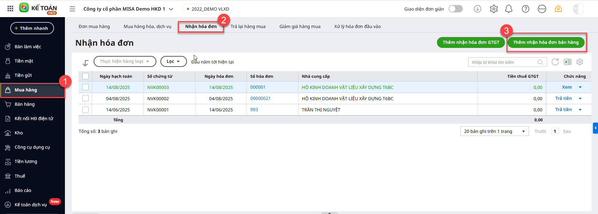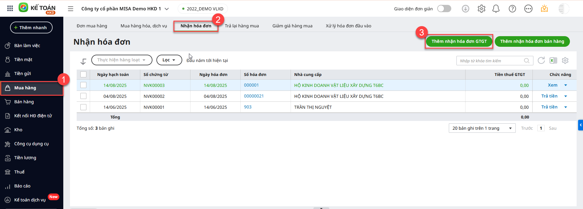 - Vào phân hệ Mua hàng\tab Nhận hóa đơn chọn Thêm nhận hóa đơn GTGT.