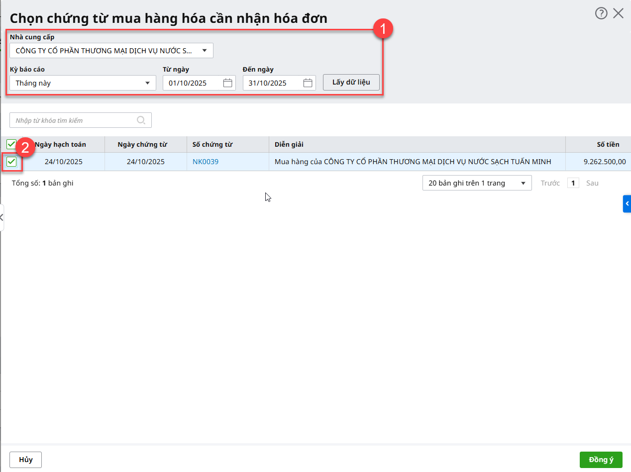 - Chọn nhà cung cấp, khoảng thời gian sau đó nhấn Lấy dữ liệu. Tích chọn các chứng từ cần nhận hóa đơn, nhấn Đồng ý.