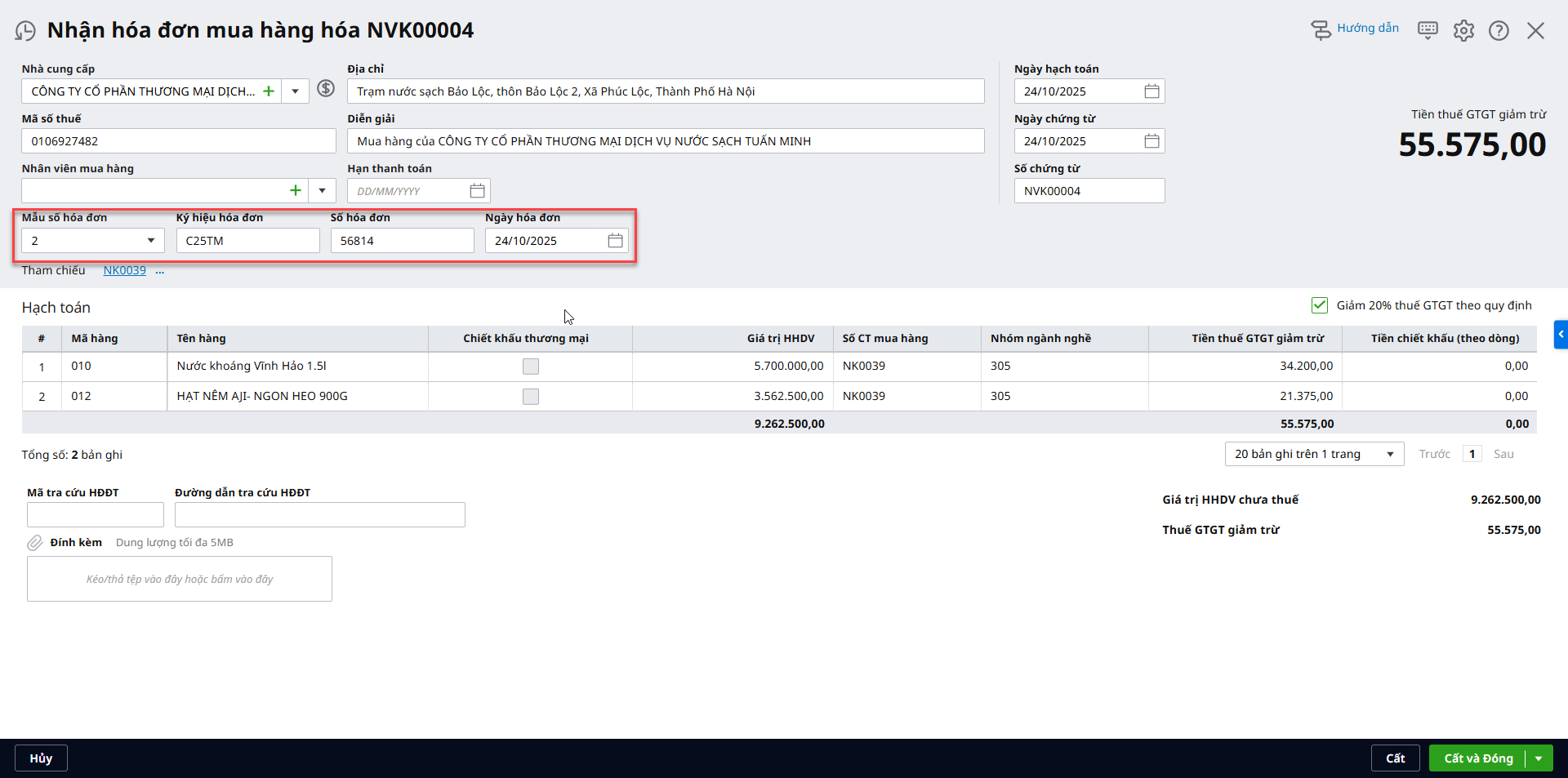 - Chương trình hiển thị giao diện Nhận hóa đơn mua hàng để hạch toán tiền thuế GTGT và khai báo thông tin hóa đơn.