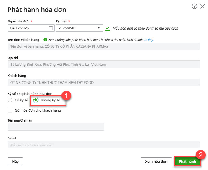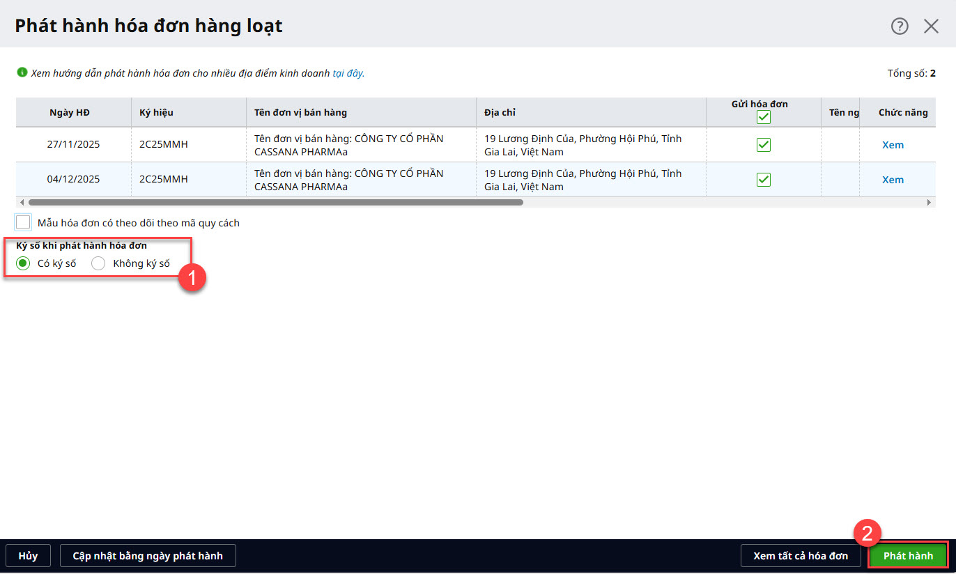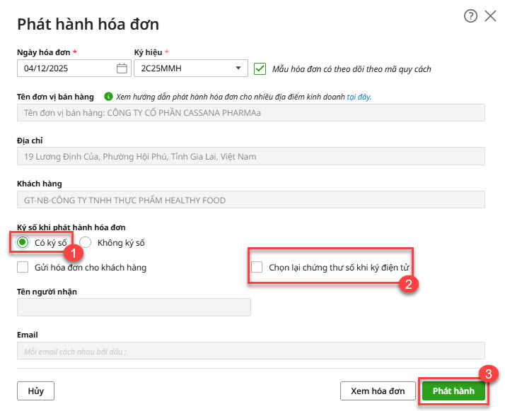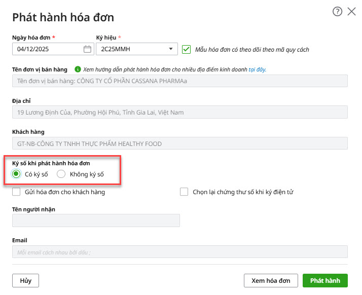 Lưu ý: Hình thức ký số khi phát hành hóa đơn sẽ lưu theo thiết lập gần nhất thực hiện.
