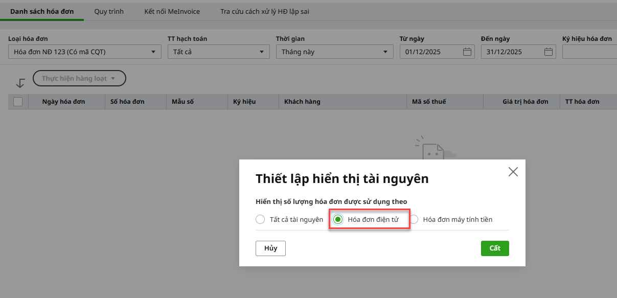 Bài viết này hướng dẫn các bước thiết lập hiển thị tài nguyên hóa đơn điện tử, phản ánh chính xác nhu cầu quản lý tài nguyên hóa đơn của đơn vị.