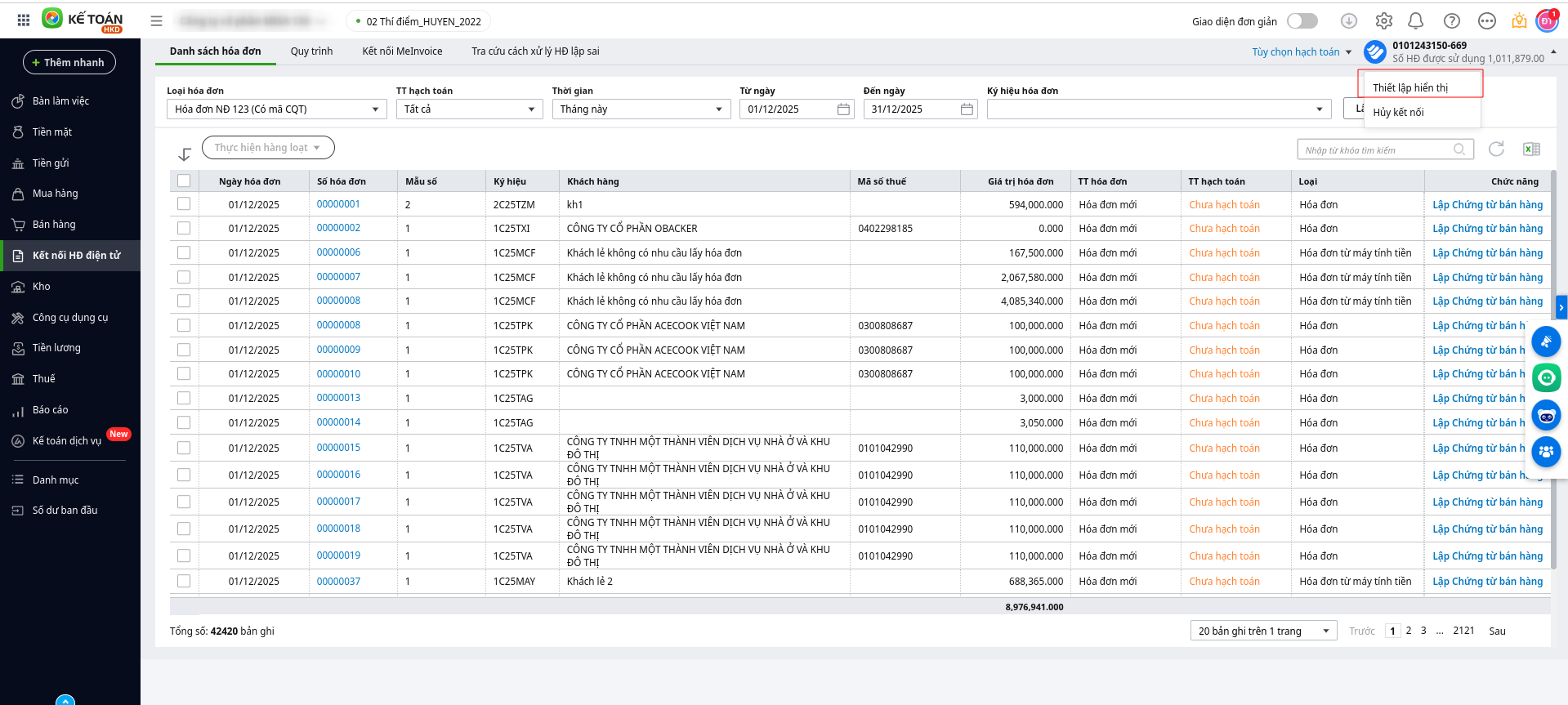Bước 1: Vào phân hệ Kết nối HĐ điện tử, tab Danh sách hóa đơn, từ thanh menu chức năng bên phải, anh/chị nhấn vào mục thông tin kết nối hóa đơn điện tử và chọn Thiết lập hiển thị.